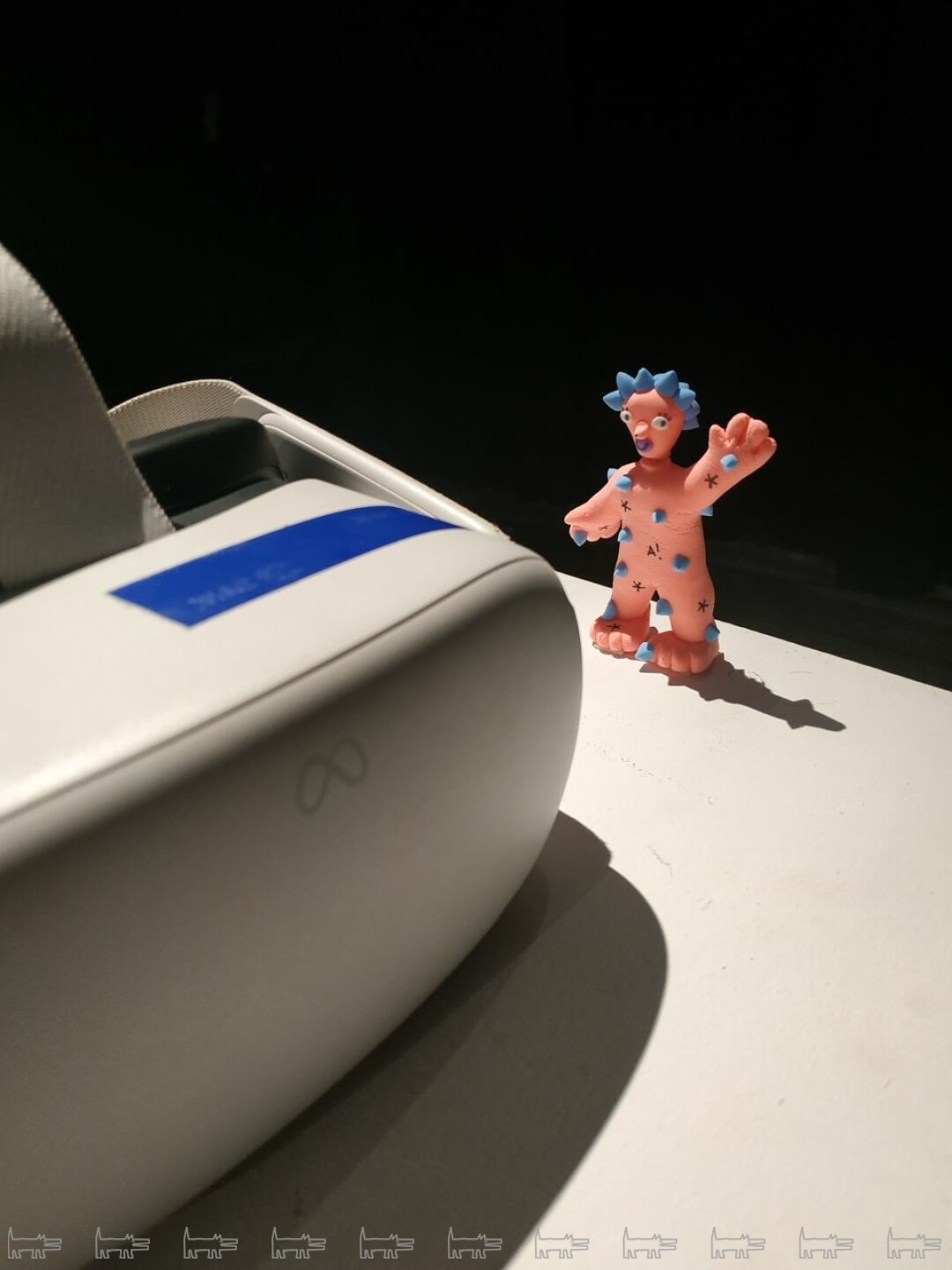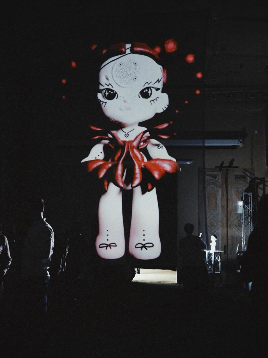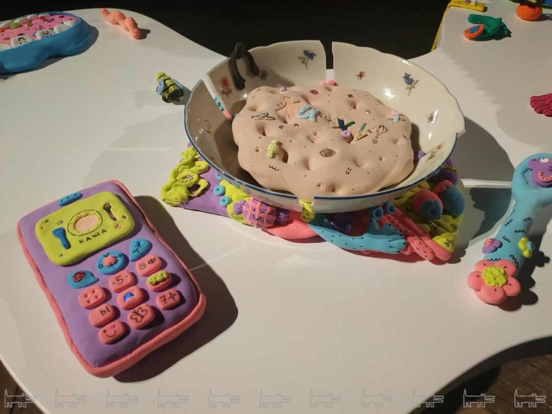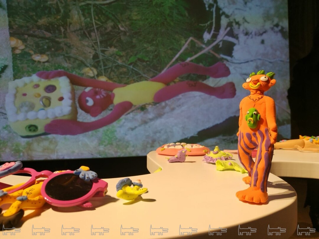 Художница заполняет отведенное ей пространство множеством маленьких фигурок, сделанных из пластилина. Она называет своих героев «чубриками». Это народец из детских фантазий, живущий среди радостей и сладостей (от конфет до торта-дворца): они даже пробрались в фотографии из путешествий Nerybka, которые показывают тут же на стенах. Есть и объекты — кнопочный телефон, «хи-хи-каша». Под звуки смеха с детской площадки можно очень долго рассматривать детали. А если надеть VR-шлем — можно оказаться напрямую внутри этой вселенной.