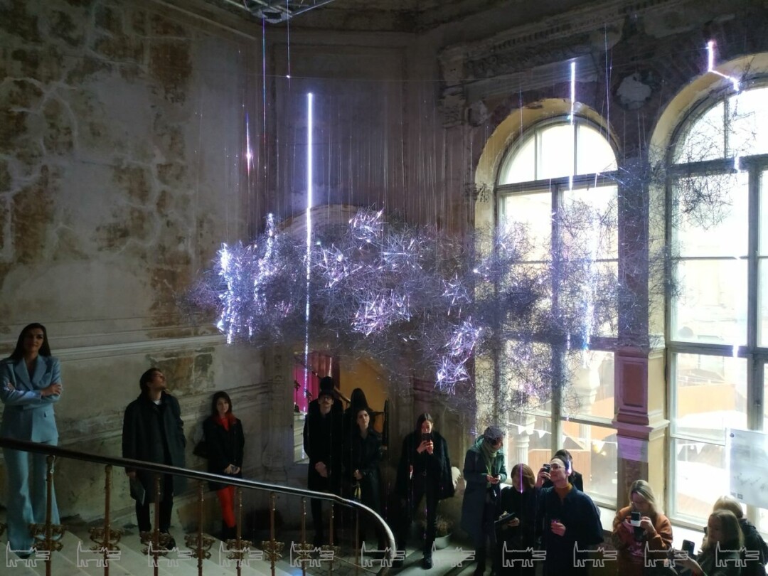 Всего в залах особняка можно увидеть девять инсталляций, сделанных с помощью новейших технологий: лазерной проекции, генеративных алгоритмов, датчиков движения и цвета, дополненной реальности, видео и 3D. Получается большой фиджитал-проект (physical + digital = phygital) — материальные объекты совмещаются с «цифрой», образуя мост между прошлым и будущем искусства. Кроме того, работы художников можно купить на специальном маркетплейсе Third Place NFT, получив виртуальную и физическую копии разом.