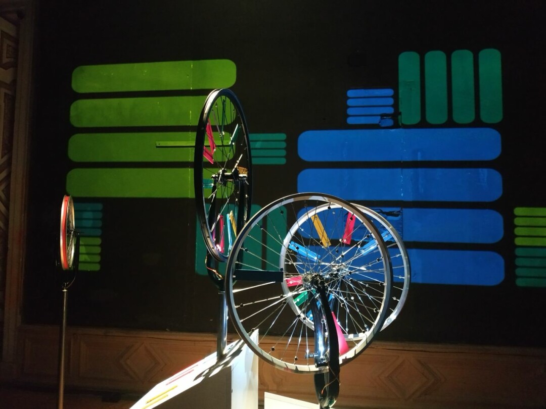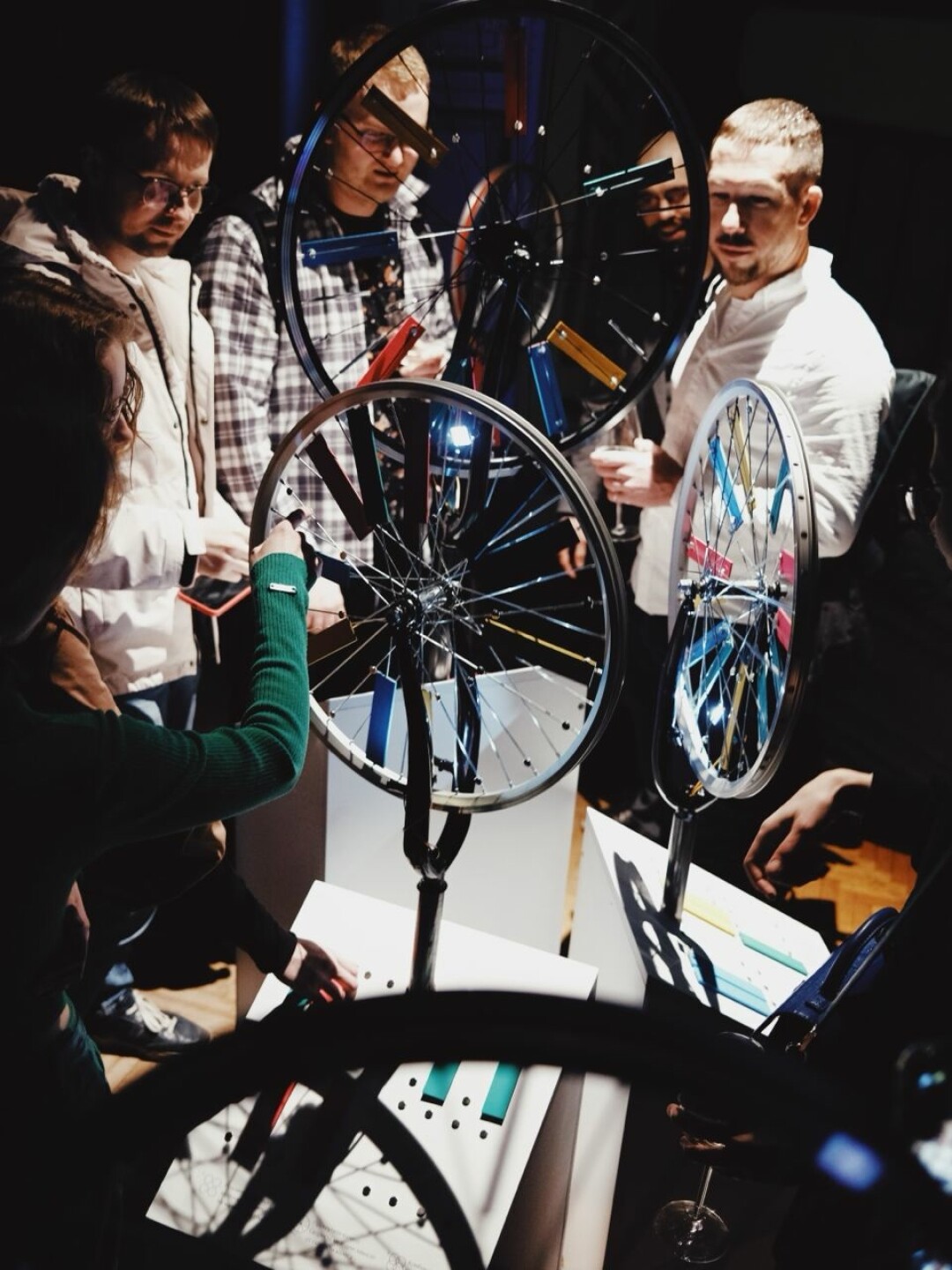 В центре интерактивной аудиовизуальной инсталляции — велосипедные колеса, установленные вертикально (прямо как знаменитые реди-мейды Марселя Дюшана!). Когда крутишь их, получаются звуки, напоминающие ксилофон или детское пианино. Интенсивность зависит от цветных пластин, которые можно добавлять или убавлять, прикрепляя на спицы с помощью магнитов. Скорость мелодии меняется, если крутить колесо быстрее. Необычный музыкальный инструмент будто задает вопрос «А что будет, если так?» и побуждает экспериментировать с ритмом и гармонией. Меняется и визуал пространства: количество и расположение цветных фигур на проекциях. Название отсылает к распространенной поломке, когда обод колеса искривляется в виде восьмерки.