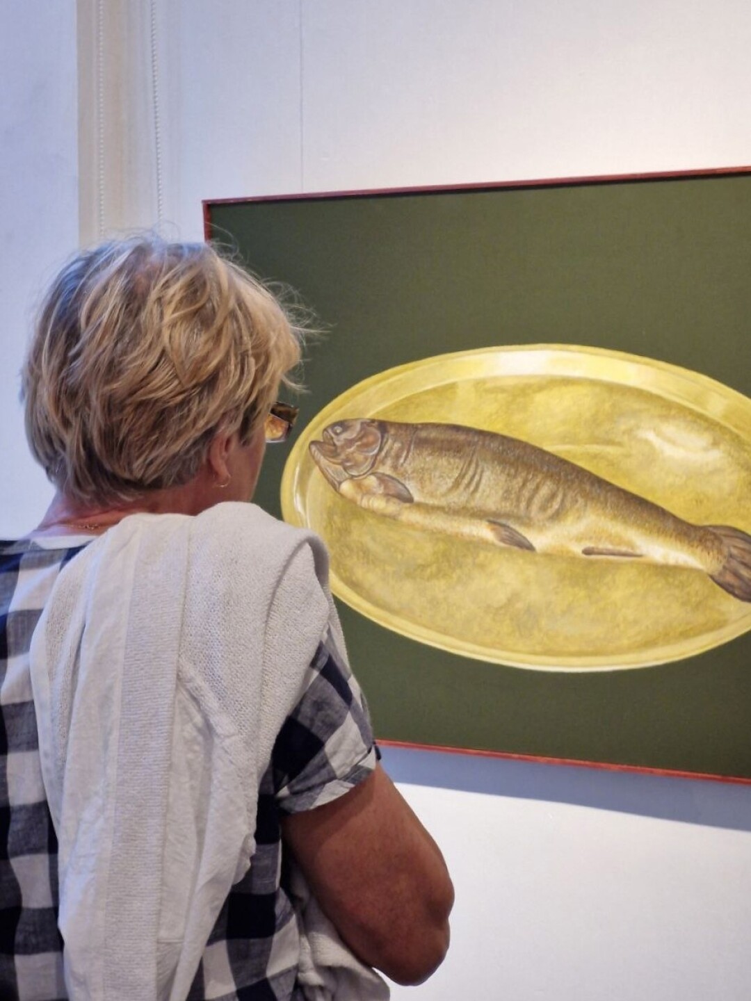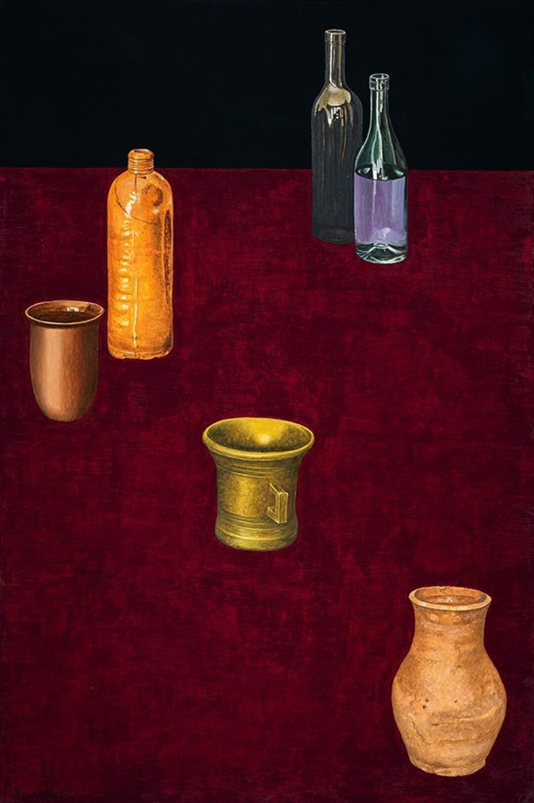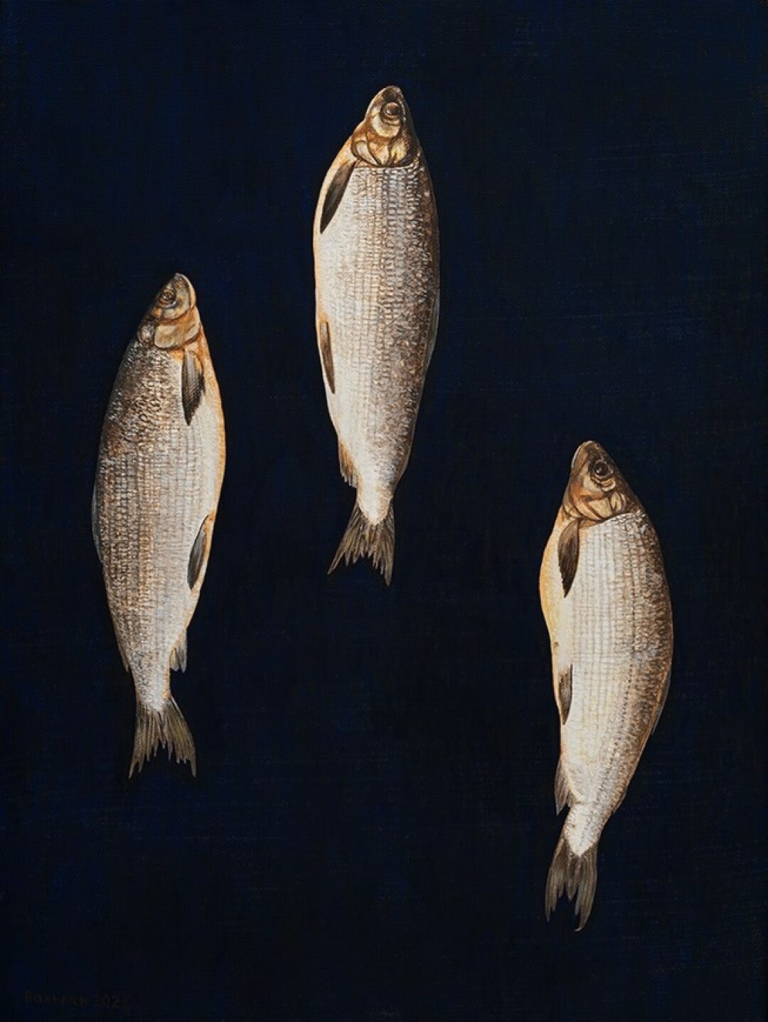 Я стараюсь лишить пространство размерности, поэтому глубокий цвет фона делает ситуацию еще менее определенной. Сколько измерений в живописном поле картины — два, три или оно безмерно? В дополнение к основному блоку работ так же в темной тональности написаны композиции из моих знаковых предметов — рыбы, яйца, яблоки, стаканы и бутылки.