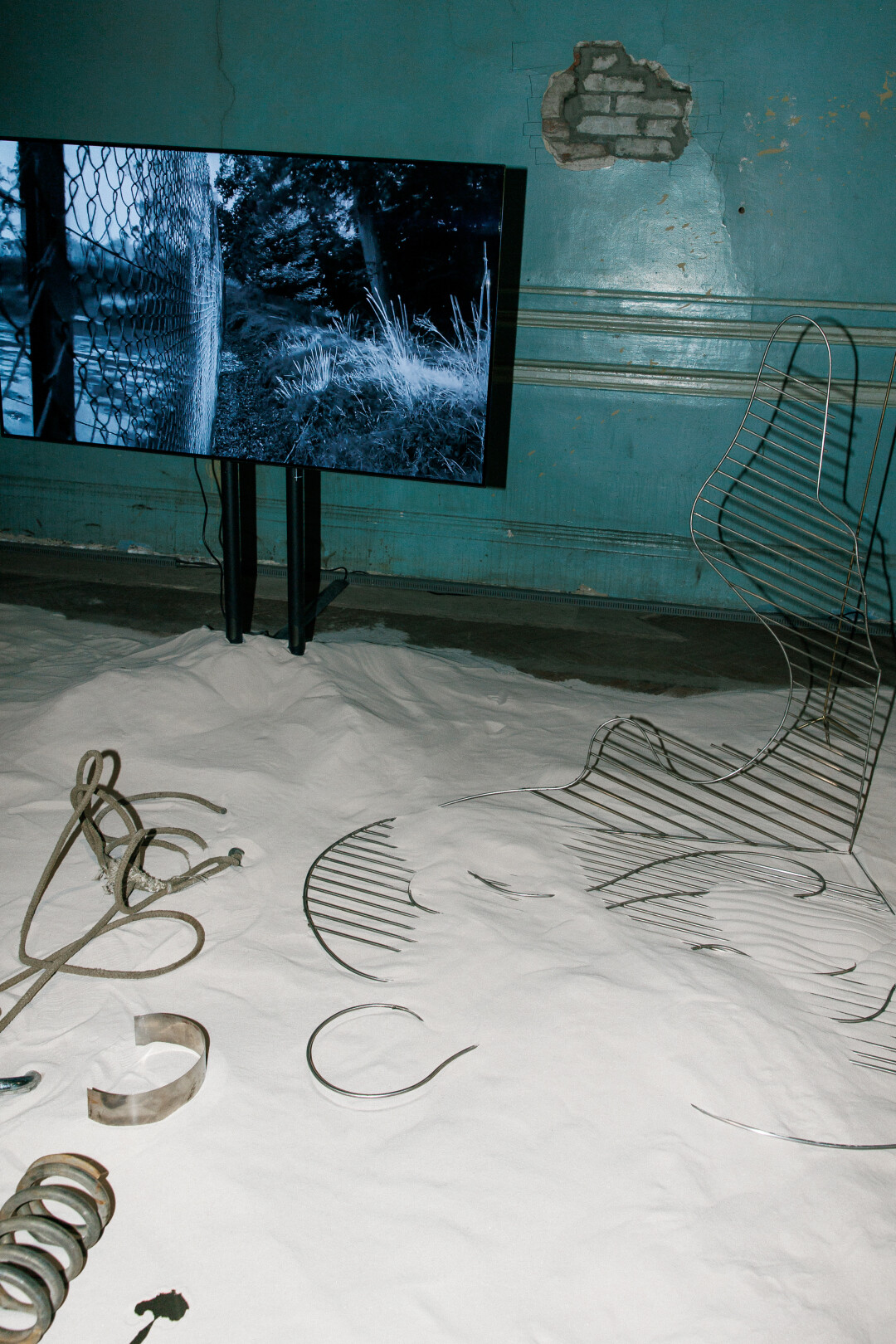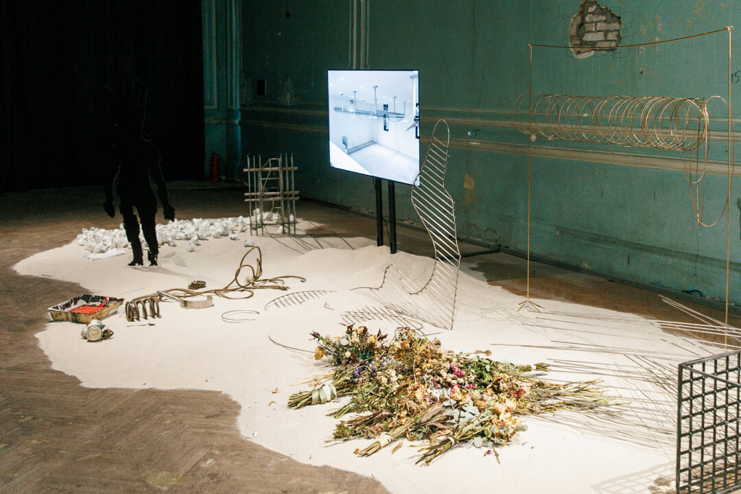 Одна из первых работ, расположенных в самом начале выставки — инсталляция петербургской художницы Лизы Бобковой, которая виртуозно совмещает брутализм с наивностью, а в работе зачастую использует металлические элементы. Ее работа для «Скрытого» — не исключение. Песчаный остров, усеянный разнообразными артефактами — от засушенных цветов до металлических пружин — отсылает к археологическим раскопкам и вдохновляет на исследование прошлого, персонального и коллективного.