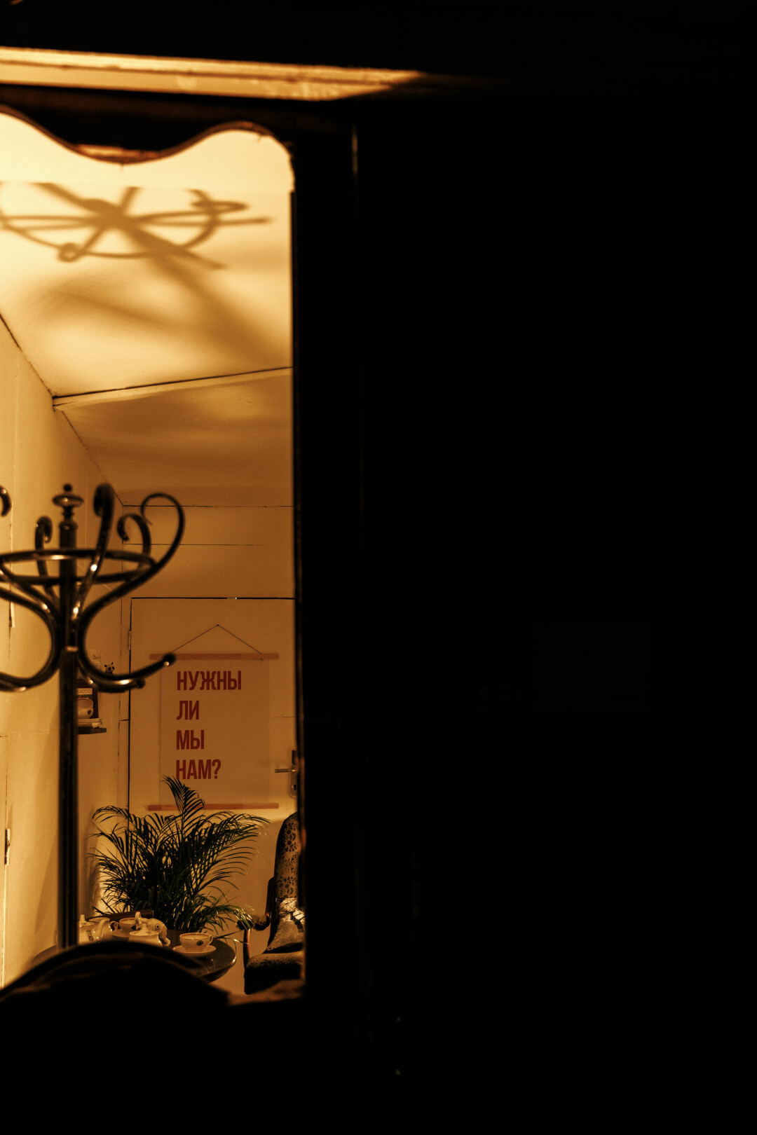 Художница предлагает зрителю отчасти иммерсивное и интимное переживание, ведь ее работа недоступна для близкого просмотра и отделена закрытыми дверьми со стеклянными ставнями. Сквозь них можно увидеть плакат с экзистенциальным вопросом «Нужны ли мы нам?» и меблированный кабинет, словно только что покинутый своим хозяином. В работе Исаевой им является персонаж культовой советской повести братьев Стругацких «Понедельник начинается в субботу» таксидермист Кристобаль Хозевич Хунта, по сюжету книги заведующий отделом Смысла Жизни.