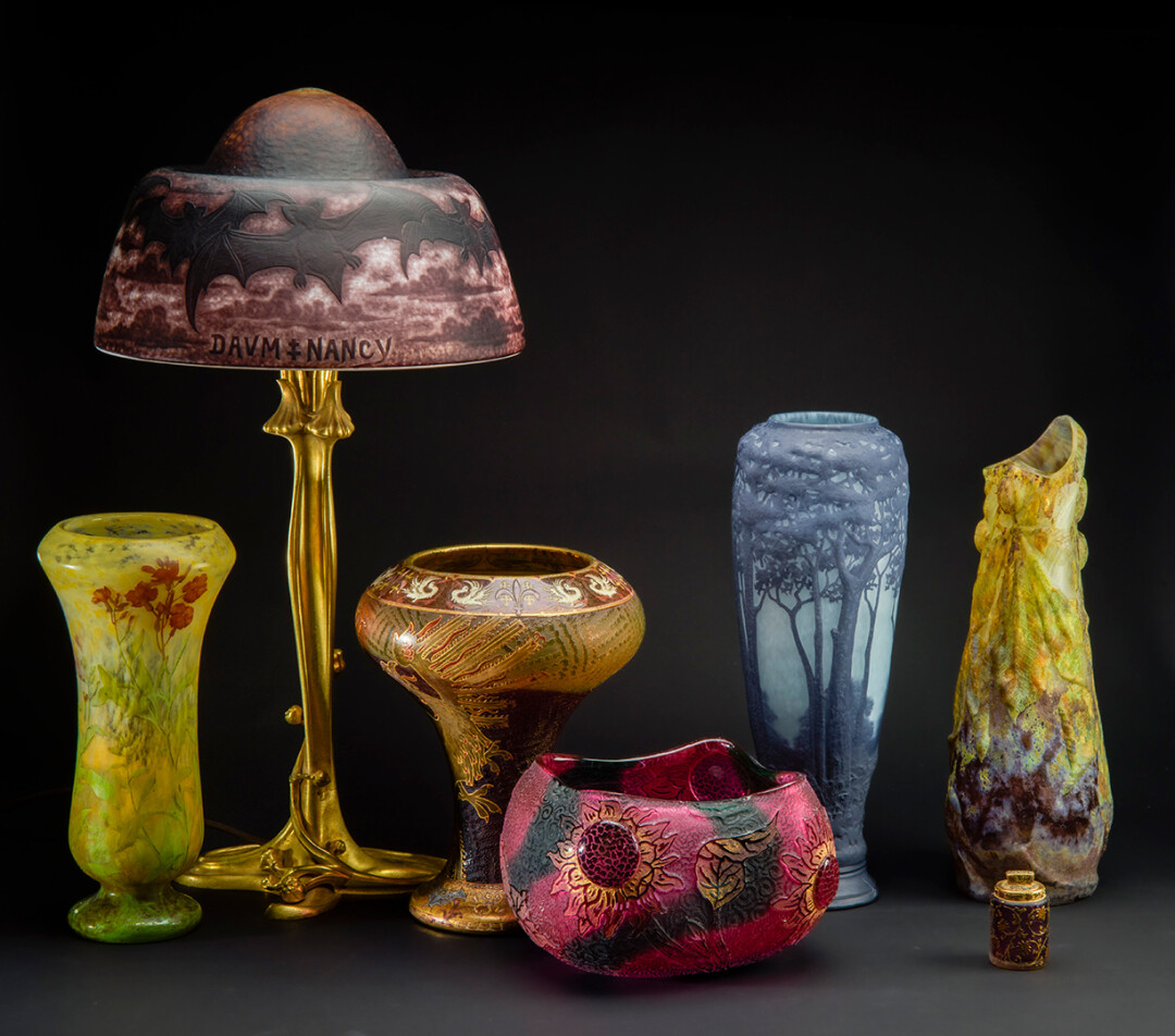 Стекло ар нуво из Лотарингии отличалось насыщенностью цветов и игрой света, что достигалось благодаря напылению и использованию эмали. Знаменитое цветное стекло этого региона неразрывно связано с несколькими знаковыми именами: дизайнеров Эмиля Галле, Жана-Антонина и Августа Дома. Визитной карточкой Галле стала техника многослойного стекла, которая позволяла создавать сложные и объемные эффекты. Кроме того, его работы известны сложной резьбой и ботаническими сюжетами. Братья Дом, с другой стороны, основав завод по производству хрусталя Daum в Нанси, стали первыми, кто начал экспериментировать с pâte de verre — техникой, позволяющей создавать матовое и красочное стекло.