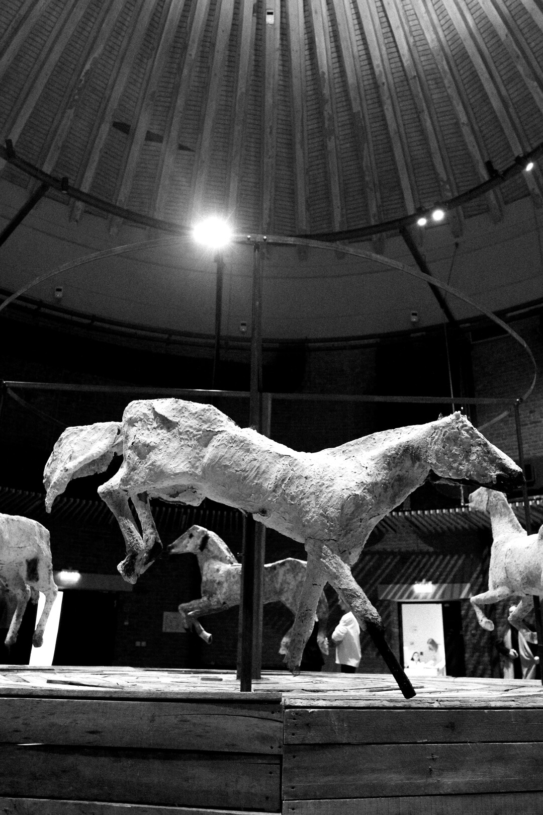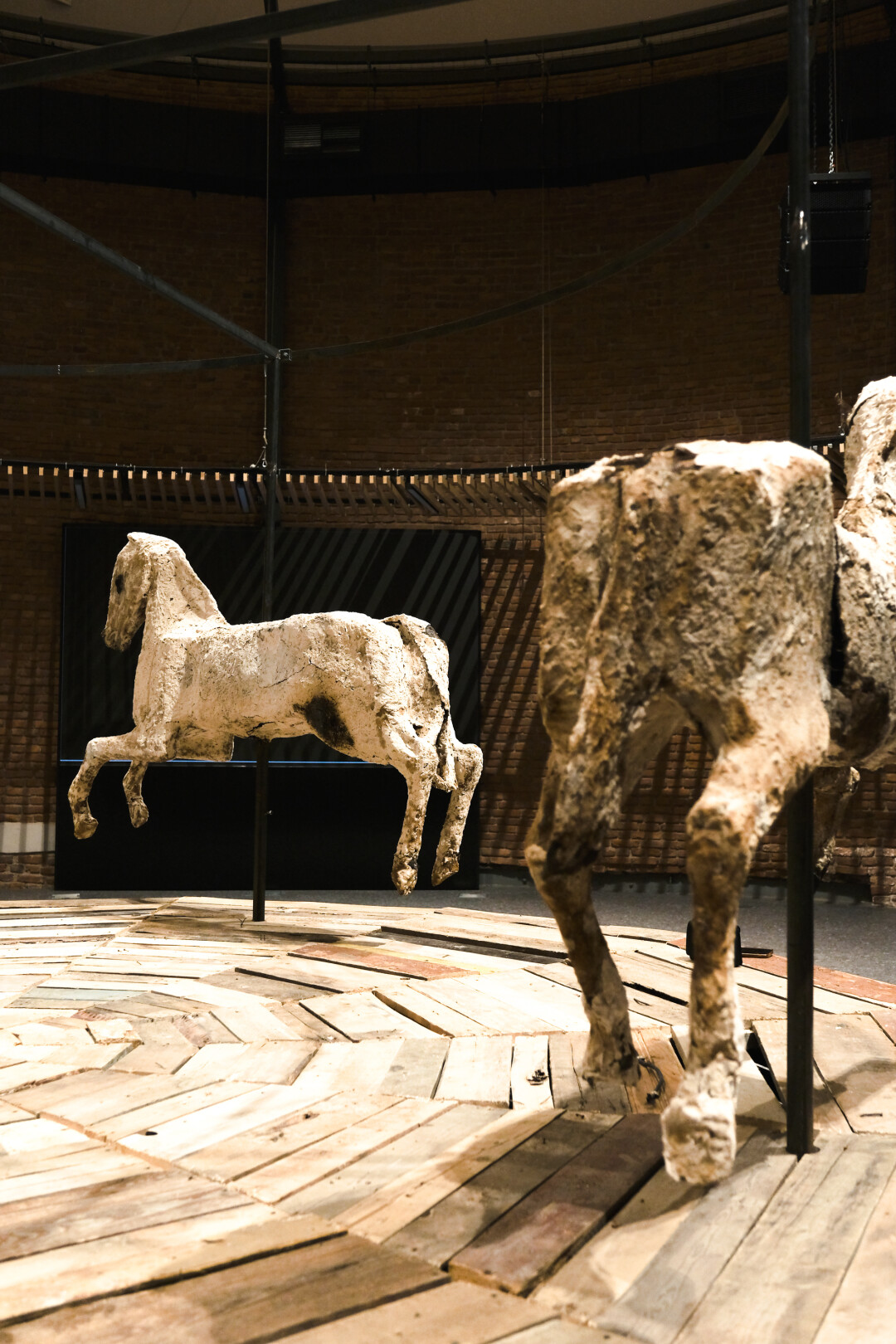 Одним из смыслообразующих констант экспозиции стала инсталляция «Постоянство веселья и грязи» ─ конструкция из металла, которая обшита деревянными досками и с фигурами коней из соленого теста по периметру. Создается образ карусели, но на ней нет веселья, это руина.