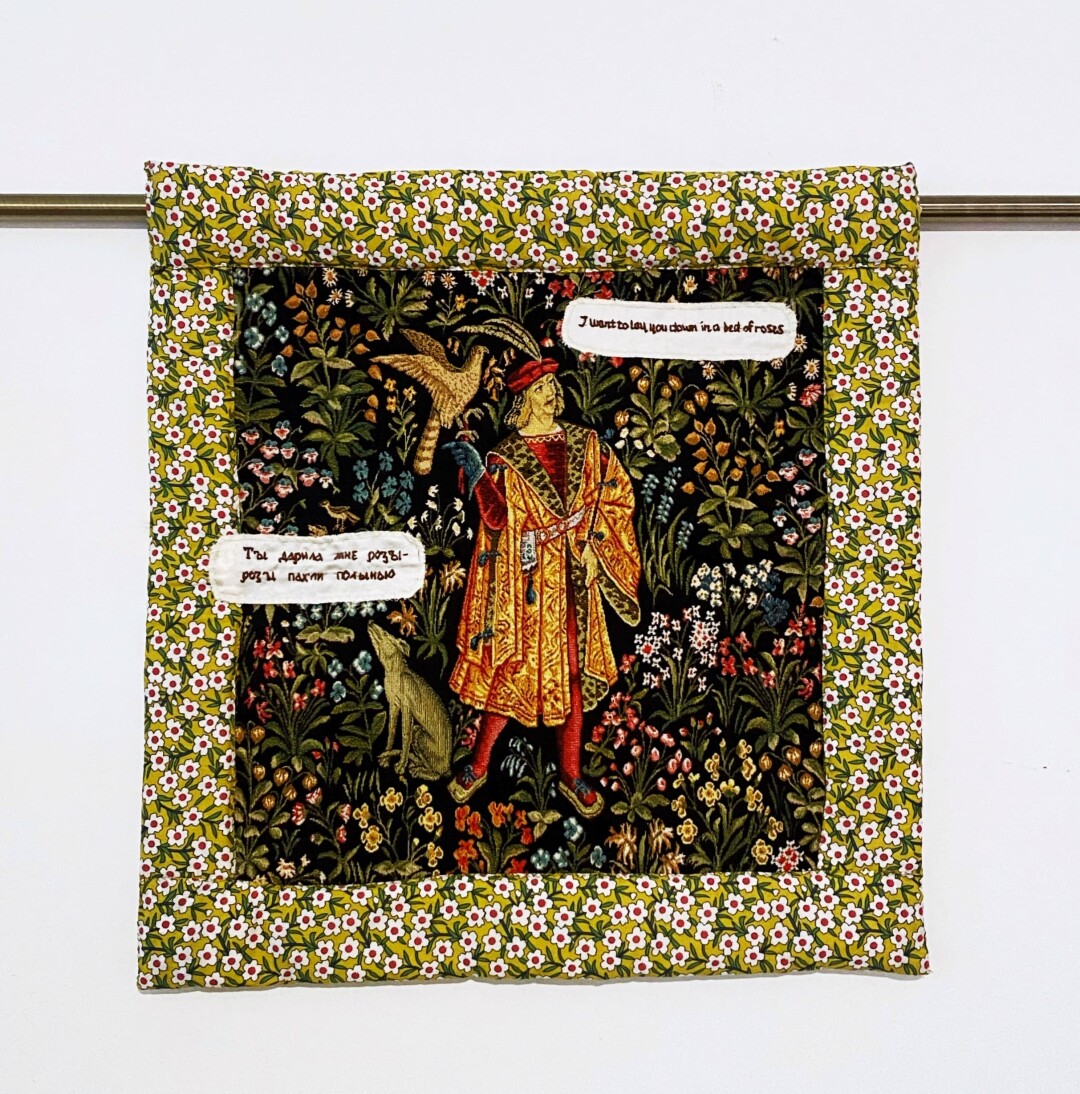Ковер на стене, который нужен и зумеру, и бумеру, и нам! Лингвист-переводчик Катя Исаева интегрирует народный фольклор и межкультурные коммуникации в медиаскусство. Ее арт-объекты деконстурируют гуманитарное знание и устойчивые понятия нового времени, собирая редимейды на стыке разных исторических слоев. В гобелене «Ты дарила мне розы» с вышивкой и ручным шитьем художница помещает средневековые образы в культмассовый сектор (а мы подпеваем!).