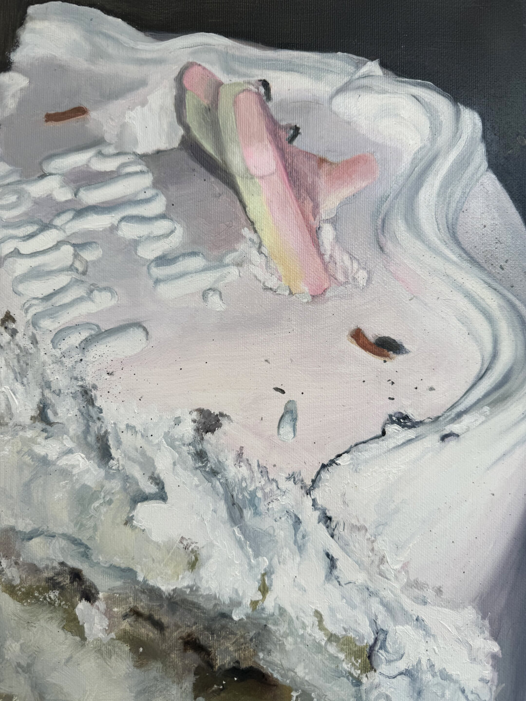Персональная выставка Алены Ковалли включает в себя живопись и графику из серии Ephemeral. Художница обращается к церемониальным моментам различных праздников, размышляя о скоротечности времени (кто из нас не тревожился накануне дня рождения?). В рамках экспозиции каждый праздник — не только повод для радости, но и напоминание, что смерть стала чуть ближе. Еще одна смысловая линия — параллель женской идентичности и торта. Нужно выглядеть нарядно, товарно-привлекательно, но время заставляет торт таять.