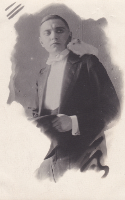 Если посмотреть с научной точки зрения, то творческая манера фотографа-художника Вячеслава Коваленко родом из искусства авангарда, в 1920-е годы он учился на ФЭКСе – Фабрике эксцентрического актера у будущих классиков советского кино – режиссеров Григория Козинцева и Леонида Трауберга. Студенты и преподаватели, которые были практически ровесниками, называли себя «ФЭКСами», как и полагается авангардистам увлекались эксцентрикой, противопоставляли классической культуре площадные зрелища. Круг общения на ФЭКСе был впечатляющим: со студией сотрудничали писатель, историк и переводчик Юрий Тынянов, кинорежиссер Сергей Юткевич и композитор Дмитрий Шостакович. Поставив несколько авангардных спектаклей, Козинцев и Трауберг занялись кино, возможно, что опыты со светом и тенью легендарного оператора Андрея Москвина, снявшего знаковые фильмы ФЭКСов, такие как «Чёртово колесо» и «Шинель», оказали влияние на деда. По крайней мере, один из его автопортретов – «Автопортрет с грызуном» – своеобразная цитата из «Чёртова колеса». Вероятно, и символизм, который явно прочитывается в работах фотографа Коваленко тоже от Москвина, в этот период старавшегося воссоздать эстетику Серебряного века средствами кино, и даже поселившегося в Царском селе в комнате, которая ранее служила кабинетом его кумиру Николаю Гумилёву. А может все многочисленные автопортреты деда – это этюды, завязанные на идеи другого студийца ФЭКС – будущего корифея советского кино – режиссера Сергея Герасимова, который разрабатывал тогда тему человека-оборотня, легко меняющего социальные маски.