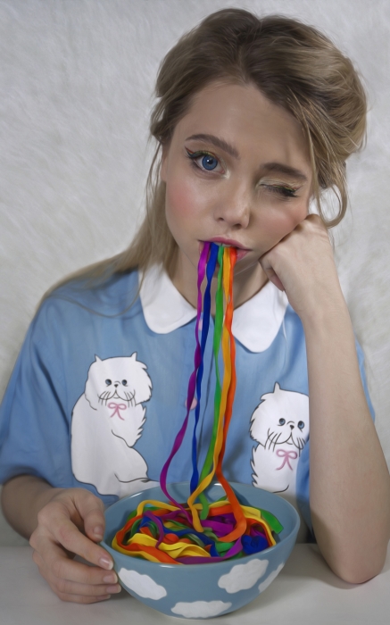 Выставку мы придумали буквально за один день и сразу начали активно воплощать. Это был просто творческий импульс. Мы решили оживить мой инстаграм и сделать своего рода театр, в котором зритель может почувствовать то же, что и я, когда делаю свои фотоработы. Мой подход — снимать только в тот момент, когда проникнут любовью к идее и тобой движет страсть к ее воплощению. Тогда изображение будет с правильным настроем. А в подготовке экспозиции участвует много людей, не все инсталляции я делаю полностью своими руками — в некоторой степени это влияет на конечный результат. Немного переживаю, что у зрителей из-за этого не будет полного погружения в мой мир.