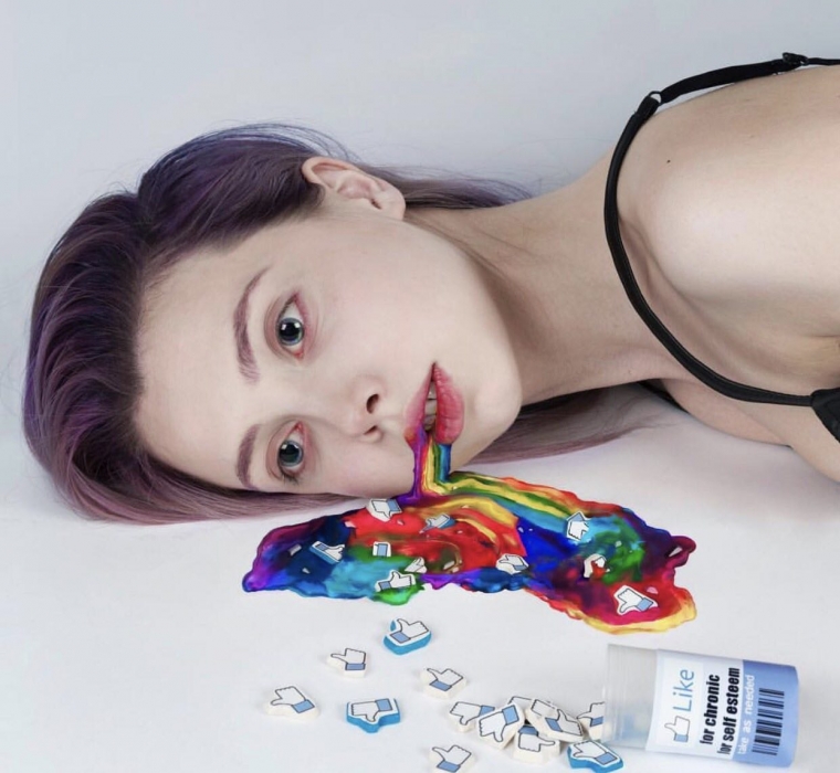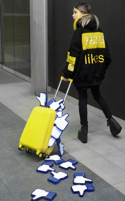Для выставки мы готовим десять интерактивных экспонатов-фотостудий. С ними можно как угодно взаимодействовать: трогать, щупать, нюхать и, конечно, залезать в них. По-моему, это самая большая проблема музеев: когда ты приходишь туда и не можешь вступить в диалог с экспонатом. Иногда даже сфотографироваться стыдно. У меня все по-другому. Мне важно, чтобы зрители почувствовали себя свободными и дали волю воображению. Например, поставлен наполненный водой аквариум с макбуком, в который можно забираться, переосмыслив самостоятельно мой кадр. Или чемодан с картонными «лайками», который разрешается взять в руки. Помимо интерактивных инсталляций представлены фотоработы, которые отражают мою личность. Каждая из них — частица меня. Несмотря на бесконечные перевоплощения, я не могу стать тем, кем не являюсь». |