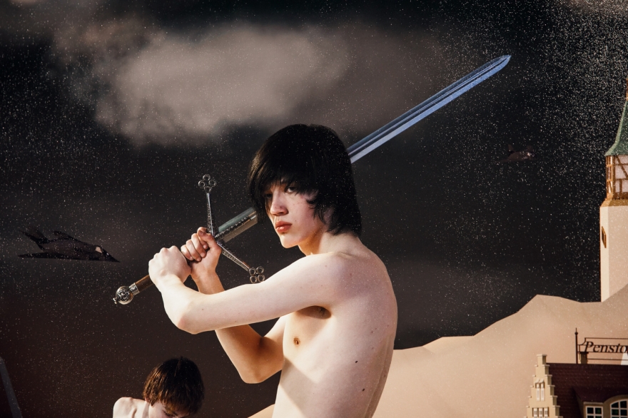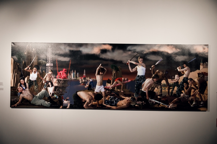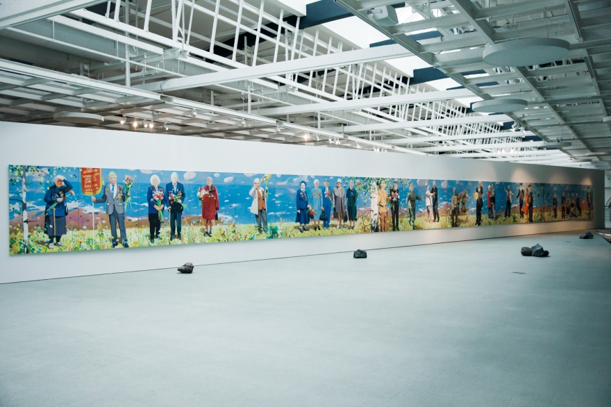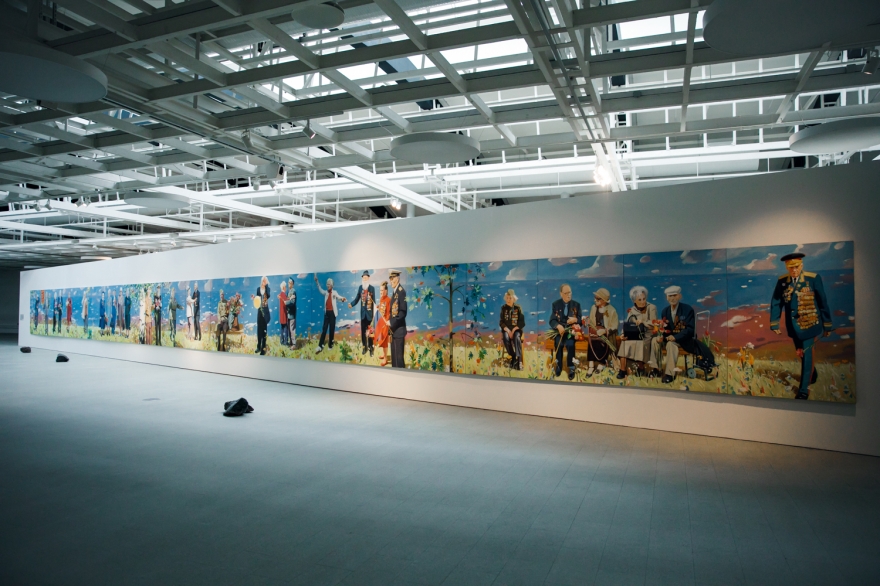 Ветераны Великой Отечественной войны — герои 30-метровой панорамы «За отвагу» — предстают на фоне реки, похожей на ту, на берегах которой разворачивалась веселая вакханалия «Тотальной живописи», раннего проекта Виноградова и Дубосарского. Но это не Волга русского березового рая, а холодный Стикс, отделяющий мир живых от царства забвения Аида. И неважно, что картина празднования 9 мая выдержана в мажорных тонах: счастливые улыбки, цветы, отглаженная форма, боевые награды — все это не может скрыть того, что День Победы клонится к закату, превращаясь в Тень Победы, а солдаты, грудь каждого из которых украшает медаль «За отвагу» (скромная на вид, но при этом особо ценная для фронтовиков, ведь давали ее только за личную храбрость и мужество в бою), — последний легион, почти скрывшийся за горизонтом ушедшего XX столетия. Уже скоро их место займут новые ветераны совсем не «священных войн», а колониальных кампаний вроде афганской. Тема войны, и прежде всего Отечественной войны, появилась в творчестве Виноградова и Дубосарского именно как реакция на официоз.