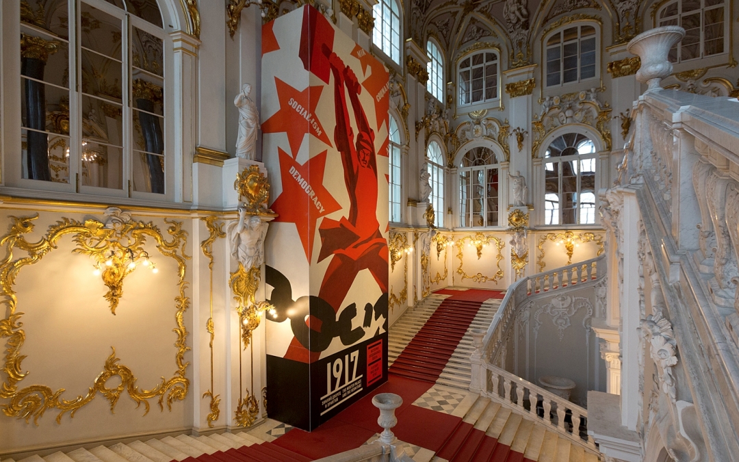 Вячеслав Федоров: Эмоциональная составляющая для нас действительно была главной. Мы примерно представляли себе посвященные 100-летию революции выставки, которые должны были пройти в других музеях, и понимали, что просто не сможем с ними конкурировать по количеству и качеству экспонатов, напрямую связанных с этой темой, — Эрмитаж, конечно, музей энциклопедический, но все же художественный, а не исторический. И хотя в конечном счете нам удалось собрать совершенно уникальные раритеты, от которых дух захватывало, — а нашим принципом было показывать только подлинники, и не просто подлинники, а подлинники-уники — для понимания их значимости требовались серьезное образование, подготовка или как минимум интерес. Чтобы сразу вызвать у посетителей Эрмитажа реакцию «да, это грандиозно», мы и придумали два приема: во-первых, завесить едва ли не половину музея транспарантами, входившими в диссонанс с интерьерами Зимнего дворца, и, во-вторых, выстроить в залах Невской анфилады 15-метровые стены с увеличенными до гигантских размеров изображениями. Ведь одно дело, когда ты видишь Николая II или Ленина на маленьких фотографиях, и другое — когда они растянуты до потолка. По-другому все воспринимается. И все, кто это видел, прекрасно понимали, что выделены те фигуры, которые сыграли большую роль в революции, что эти акценты расставлены не просто так. Хотелось обратить наконец внимание людей на эти события, ведь многие так до сих пор и не осознают, что же произошло в 1917 году.