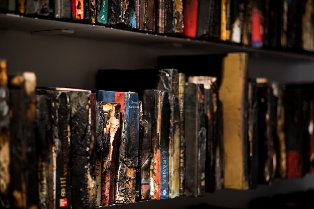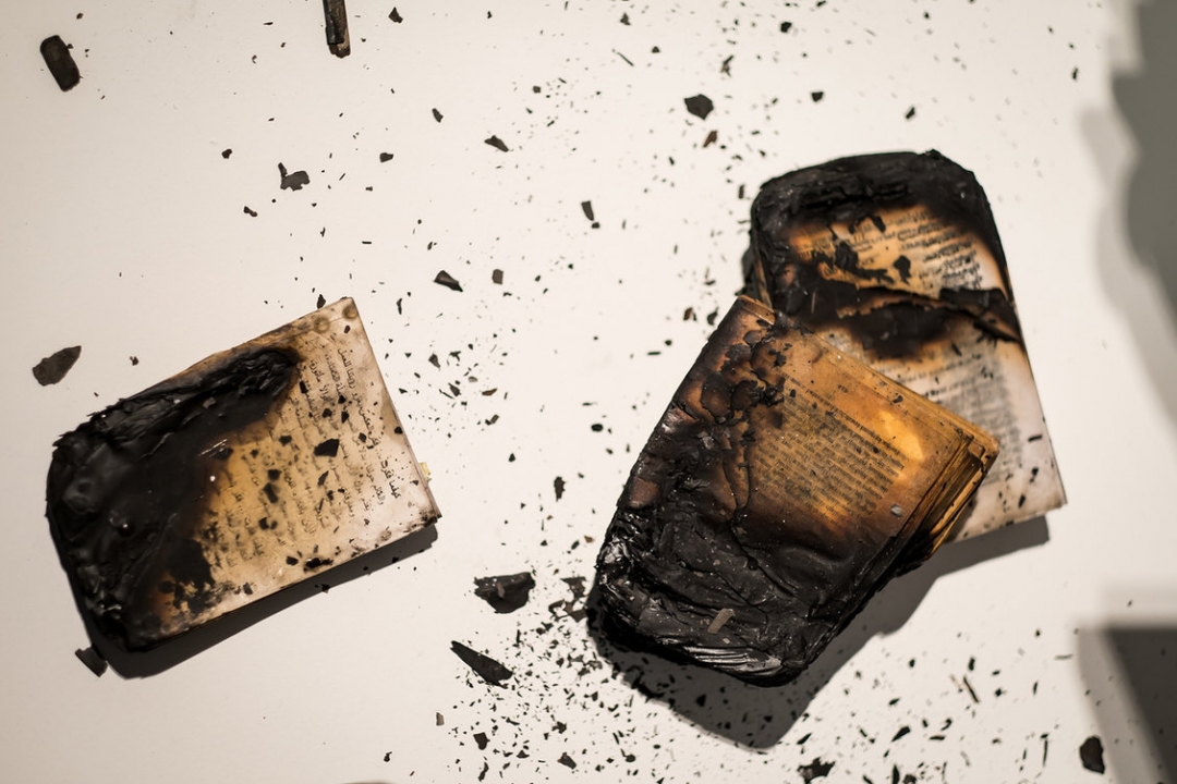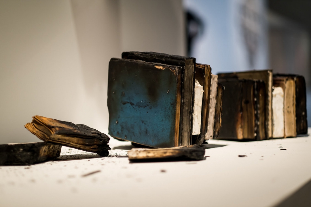 Инсталляция художника из обгоревших изданий — это не оммаж Михаилу Булгакову. В версии Ахмеда Нух Аль Захеда рукописи и книги горят и еще как: их руины символизируют утрату интереса к чтению, а с ним и тонны знаний.