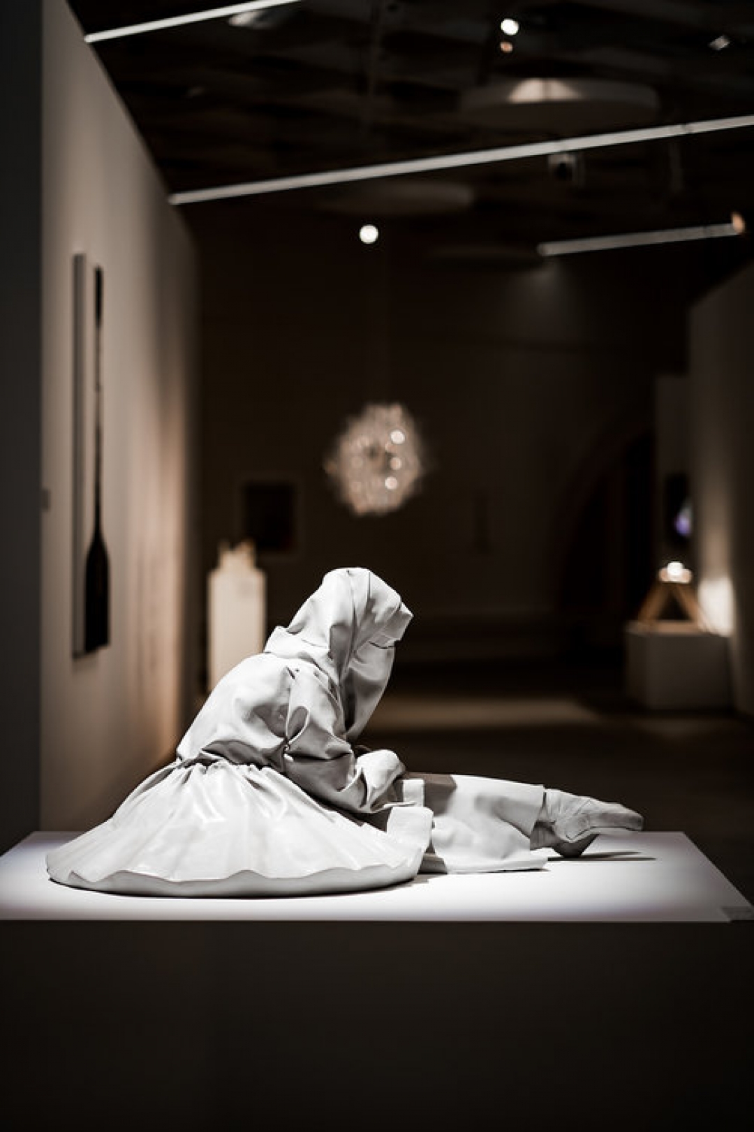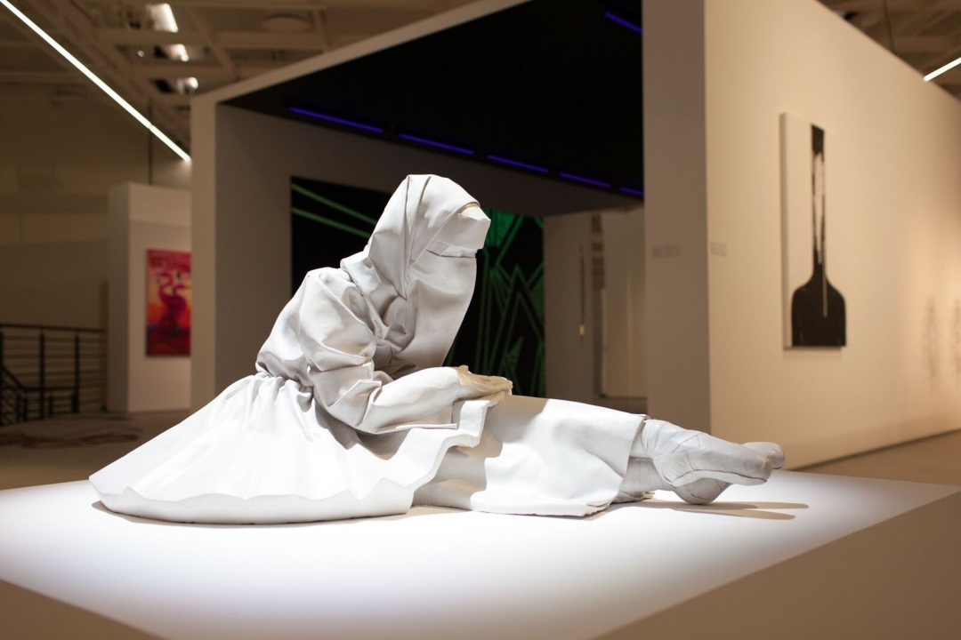 Гипсовая балерина на выставке в «Манеже» — продолжение перформанса, который художница устроила в Дохе. На одной из основных площадей города она провела некоторое время, сидя в такой же позе, одетая в пачку и национальный хиджаб и наблюдая за прохожими. Это работа о смешении культур и роли женщины в современном Катаре: столкновение свободы и традиций. Например, жена одного из кураторов выставки работает в музее, водит машину и может ходить в той одежде, в какой захочет. Однако заниматься балетом (в европейском понимании) — до сих пор считается не совсем приемлемым для женщины занятием.