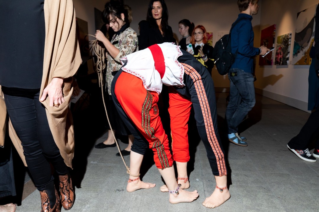 Помимо работ на стенде галереи, на превью ярмарки я показала новую версию перформанса «Пип шоу». Один и тот же перформанс при разных обстоятельствах всегда становится другим, так как он невозможен в отрыве от среды и ее контекста. На этот раз я решила слегка поиронизировать над самим понятием ярмарки, взаимоотношениями художника, зрителя и галереи. В ходе перформанса, четвероногое существо в ярком скоморошеском костюме появляется и покорно следует на поводке от стенда к стенду за своим проводником. Зрители, будучи насильственно втянутыми в перформанс, реагировали по-разному, кто-то начинал преследовать, стремясь зафиксировать происходящее на телефон, кто-то пугался, но старался сохранять видимое спокойствие, делая вид, что не считает происходящее чем-то необычным — ведь он подготовлен, и знает, что такое ярмарка современного искусства. Мне всегда интересна реакция зрителей, так как они — такая же неотъемлемая часть перформанса как среда, в которой он происходит.