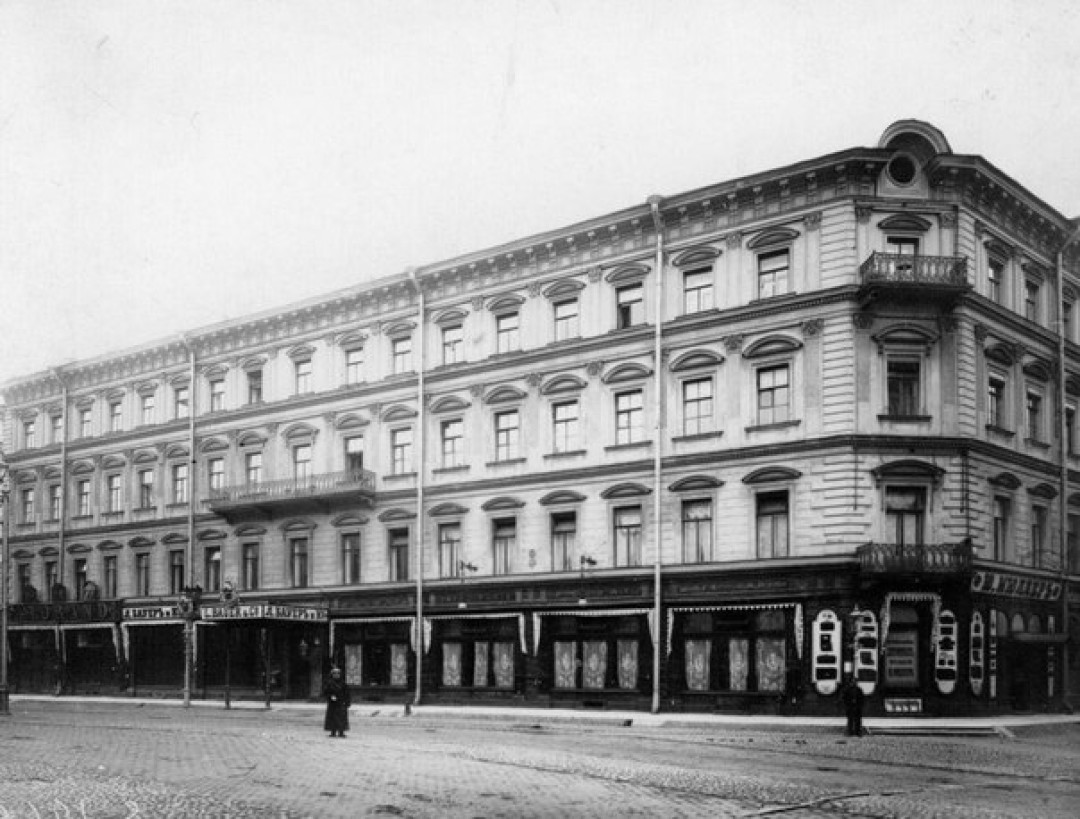 Дом, который сохранился до наших дней, был построен для кассира Императорских театров титулярного советника Руадзе. Еще до окончания строительства здания в его крыле по Большой Морской расположилась известная ювелирная фирма Карла Фаберже, которая просуществует здесь до начала XX века. Здесь же жил и сам хозяин. В доме был большой зал, который сдавался для концертов, спектаклей, литературных вечеров. На рубеже веков здесь были меблированные комнаты Мухиной, в которых жили Владимир Ленин с Надеждой Крупской, а также Федор Шаляпин. Здесь же останавливалась Ольга Книппер во время весенних гастролей МХАТа в 1902 году. Отсюда она пишет Антону Чехову в Ялту.
