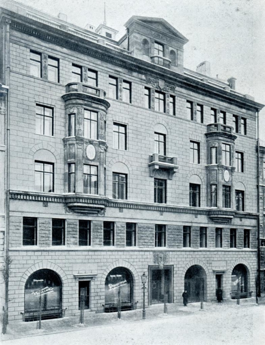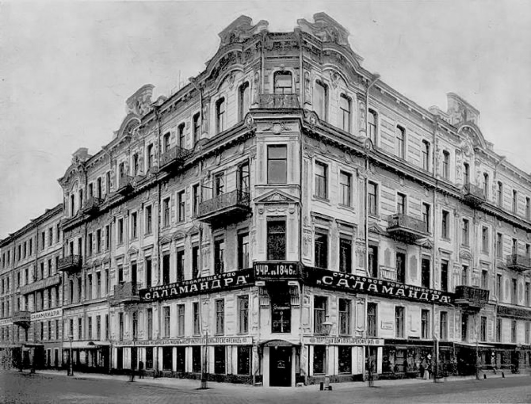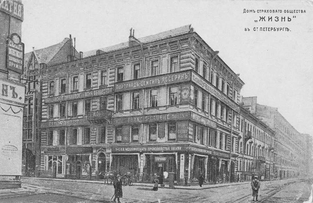 В этом здании с элементами модерна, в котором в начале XX века размещалось страховавшее от пожаров общество, в середине прошлого века жили разные люди искусства — артистка Софья Преображенская, балерины Агриппина Ваганова и Татьяна Вечеслова. С 1936 по 1941 годы в одной из квартир этого дома жил композитор Исаак Дунаевский, автор музыки к культовым советским фильмам «Веселые ребята», «Волга-Волга», «Кубанские казаки». Здесь начиналась переписка композитора и почитательницы его таланта Людмилы Райнль, которая осмелилась написать автору музыки из полюбившегося ей фильма «Цирк» и попросить у него ноты. И эта невинная просьба подтолкнула обоих к многолетней любовной переписке.