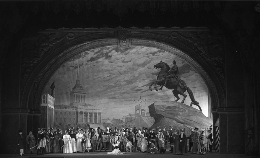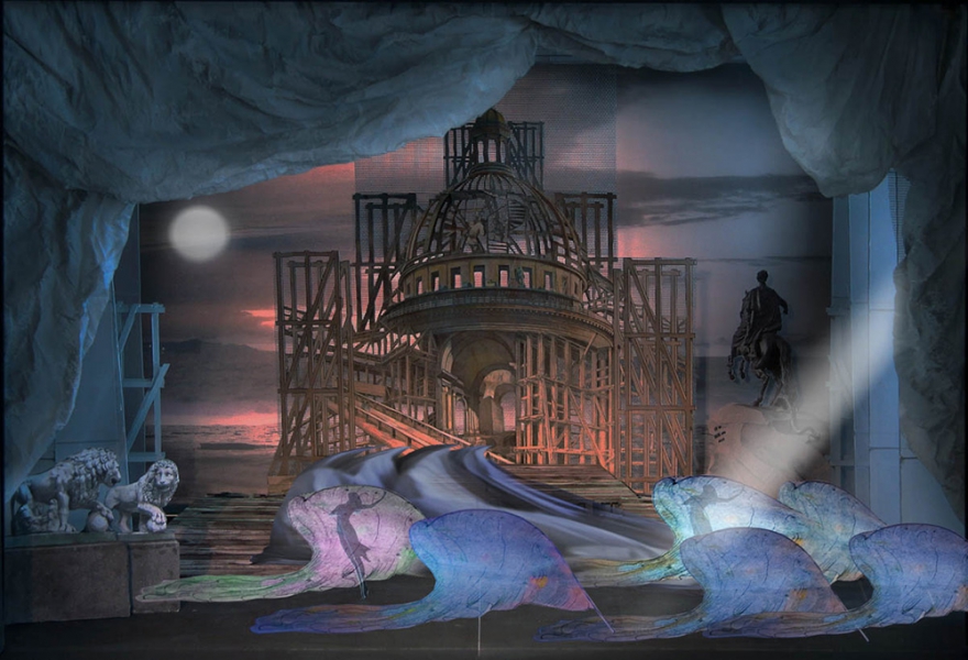 Либретто балета создавалось к 150-летию Пушкина не только по поэме «Медный всадник», но также по мотивам сочинений поэта «Арап Петра Великого» и «Домик в Коломне» - поэтому среди героев спектакля помимо мелкого чиновника Евгения и его возлюбленной Параши присутствуют также Петр I, Меншиков, Ибрагим Ганнибал, шут Балакирев, иностранные послы, а действие происходит как во время наводнения 1824 года, так и в начале XVIII века во время строительства Петербурга и одной из петровских ассамблей. В результате в трехактном спектакле можно видеть и Сенатскую площадь с Медным всадником и Исаакиевским собором в лесах, и верфь в Адмиралтействе, и домики обывателей на Васильевском острове, а солнечный день во время сцены народного гуляния сменяется сценой разрушительного наводнения — зрители в зале не будут разочарованы спецэффектами в виде «кидающихся» прямо им в лицо гигантских волн. А вот чтобы понять, как постановщики добьются этого 3D-фокуса, нужно прийти на премьеру в «Мариинский-2», 31 марта, 2 или 3 апреля.