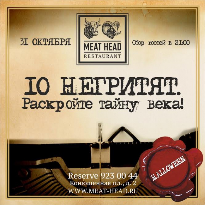 Вечером 31 октября Хэллоуин в ресторане будет посвящен таинственному миру Агаты Кристи и ее лучшего криминального романа «Десять негритят». В назначенное время герои романа будут ждать гостей за обеденным столом.