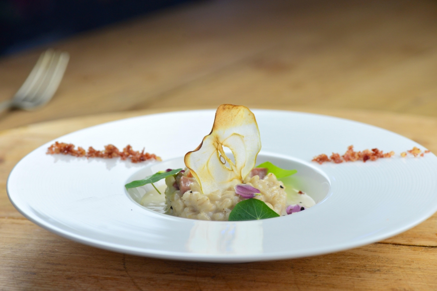 - Орзотто с яблоками, шпеком и кремом из сельдерея (Orzotto, mele, Speck, Crema di sedano rapa)