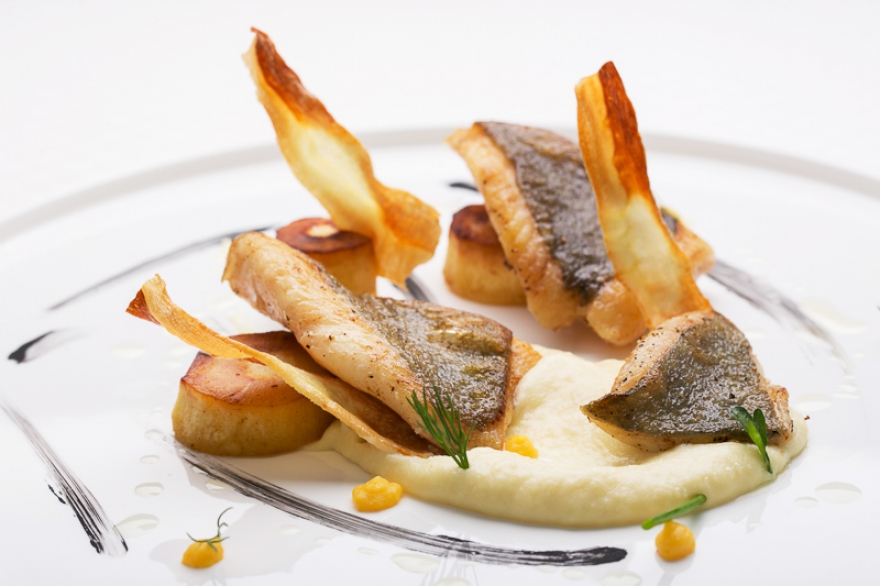 - Филе рыбы солнечник с пастернаком, конфи из лимона и соусом из шампанского