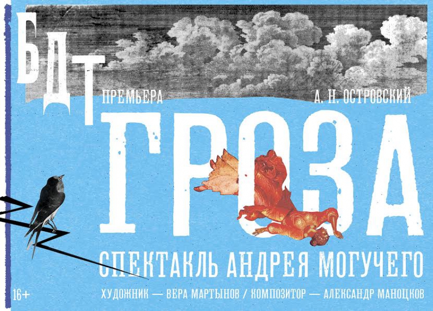 Худрук БДТ Андрей Могучий поставит спектакль по пьесе Островского «Гроза». От многочисленных вариаций постановку будет отличать то, что текст драматурга полностью сохранят, а реплики главных героев — Катерины и Бориса — положат на музыку, сообщили нам в пресс-службе театра. В постановке будут играть Марина Игнатова, Ируте Венгалите, Сергей Лосев, Мария Лаврова и другие. Художником станет ученица и соавтор Дмитрия Крымова Вера Мартынова, художником по костюмам —молодой дизайнер Светлана Грибанова, а композитором — петербургский мультиинстументалист Александр Маноцков, который пишет в различных жанрах: от авангарда до церковной музыки.