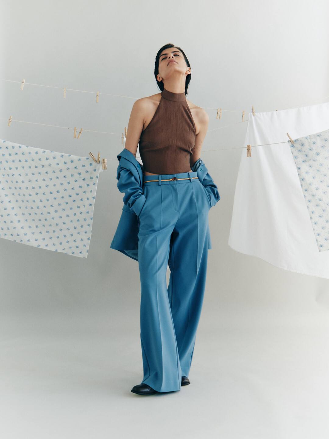 С первого дня в нашей одежде мы уделяем огромное внимание комфорту женщин. Поэтому монопродукт, с которым мы стартовали, — это смарт-костюм. Такая идеальная трикотажная двойка для женщины большого города, wonder woman, у которой много задач: она и мама, и деловая женщина, и человек, увлеченный хобби. Наш костюм — это свитшот свободного кроя и смарт-брюки из итальянского трикотажа с добавлением шелка. Отсюда и название бренда LaTrika: «трикотаж» — «трико», а «ла» — это для нее: «Трикотаж для нее». Вот так гармонично это соединилось. Со временем лекала костюма немножко трансформировались — тенденции меняются, и мы внимательно работаем с пропорциями. Я включаю своего внутреннего архитектора и лично занимаюсь разработкой лекал с технологом, с конструктором, работаю над кроем. Наш экспериментальный цех — это место силы. Мы стараемся помочь разным женщинам найти комфортную для себя одежду. Ведь высоким или, наоборот, миниатюрным девушкам часто бывает сложно подобрать хорошо сидящую вещь.