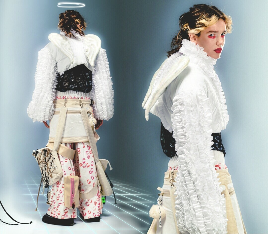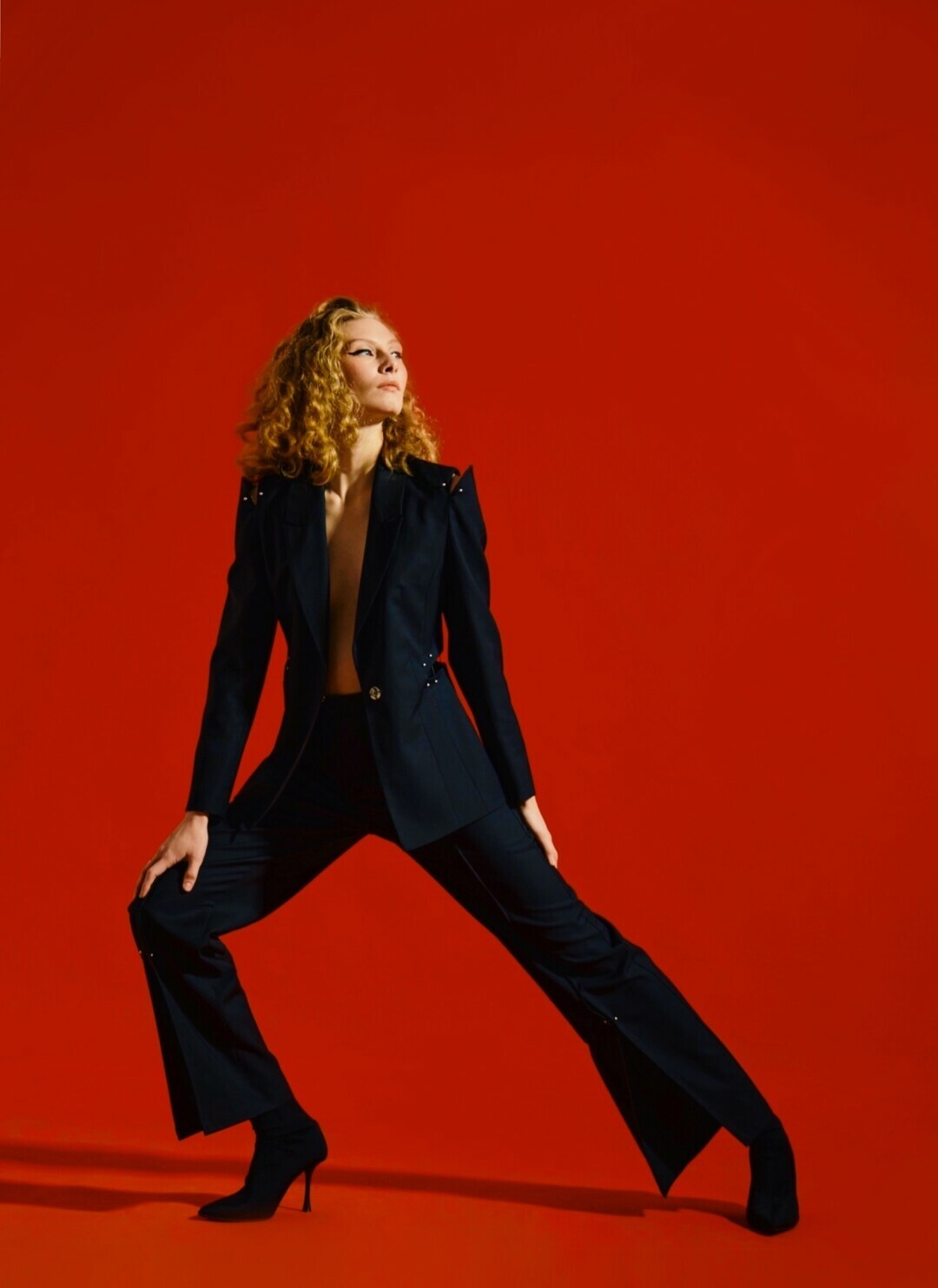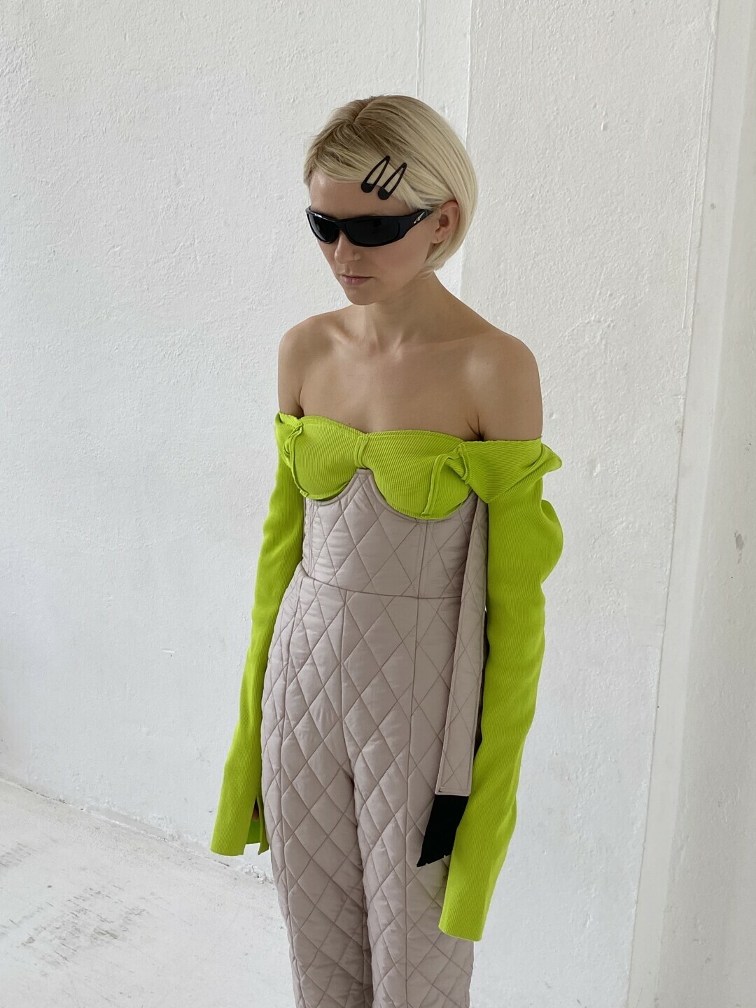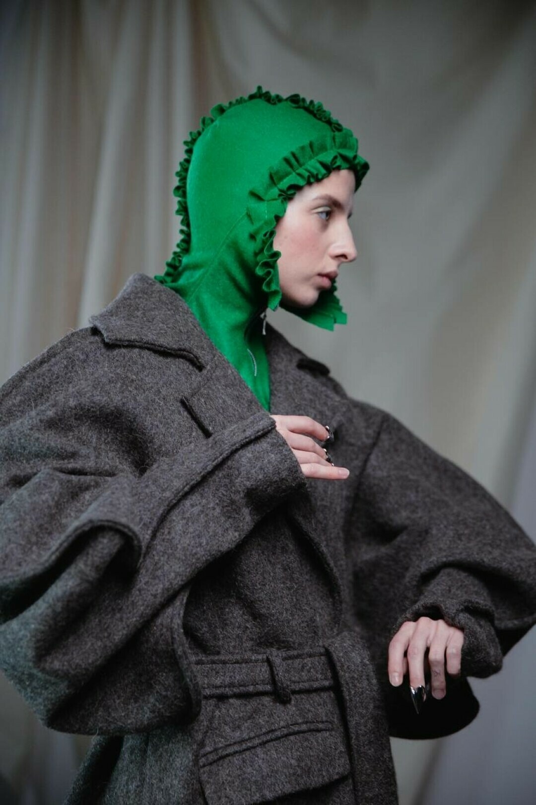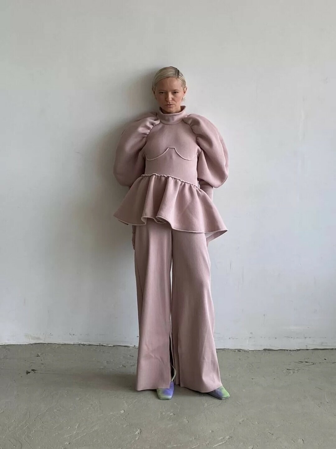 Настя Соломеина — панк в костюмных делах. Дизайнер стремится к личной свободе и полной независимости. Эту коллекцию она создала вручную на японской машинке из архивных тканей модных домов: от Dries van Noten до Rick Owens. Исторический крой, отсылки к прошлому, современный стайлинг, самодостаточные сильные девушки — это то, что становится частью мира костюма Сolomeinysh. Такие вещи можно гармонично носить и в жизни, и на сцене. Настя Соломеина: «Я не устану повторять, что даже у короля мрачного гламура и гранжа Rick Owens в коллекциях есть зачастую незаметные намеренно детали костюма мушкетерской эпохи и элементы моды эпохи модерн».