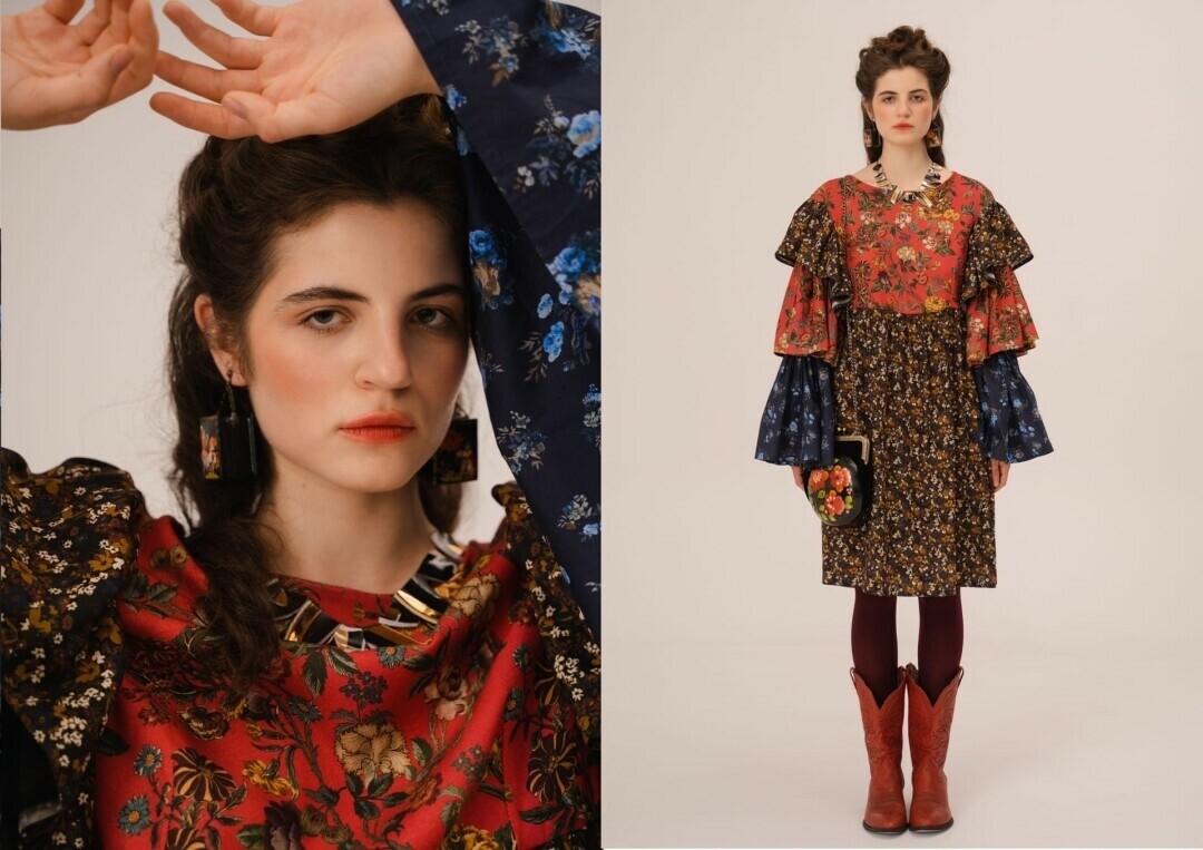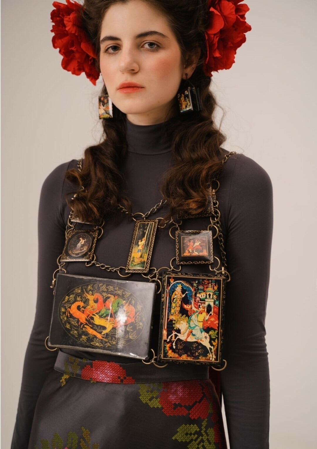 Молодой дизайнер родом из Калуги Кира Орлова вдохновилась воспоминаниями из детства, иллюстрациями Билибина, картинами Васнецова. Так появилась аутентичная капсула в народном стиле из вторично использованных материалов. Народный дух и любовь к сказкам чувствуются в вещах. Например, кольчуге из крышек поломанных шкатулок, аксессуарах из осколков бабушкиного дулевского фарфора. Забытые палехские и мстерские шкатулки обрели новую жизнь в виде основы для сумок и клипс. Кира Орлова: «Я трепетно и уважительно отношусь к предметам из прошлого. Воспоминания о бабушкиных лоскутных одеялах, характерные цвета напрямую отсылают к истокам и воспоминаниям, которые связывают людей. Поэтому коллекция носит название “Душа”».