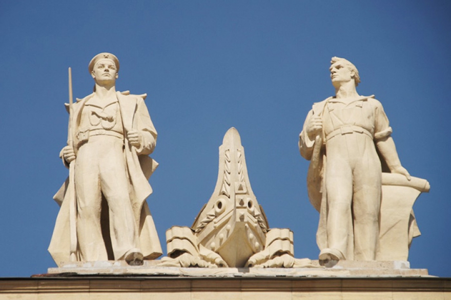 «Дом военморов» Жилой дом военноморского начальства, известный также как «адмиральский дом», построен по проекту гостиницы «Интурист». Отель, задуманный советским руководством в начале 1930-х, в процессе строительства сменил назначение и был переработан согласно новым стилевым тенденциям: здание украсили многочисленные барельефы, колонны, и оно приобрело неоклассические черты. На крыше дома установлены шестиметровые статуи матроса и рабочего работы скульпторамонументалиста Якова Троупянского. |