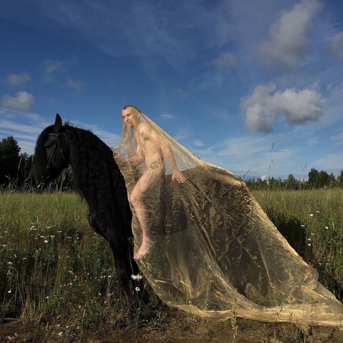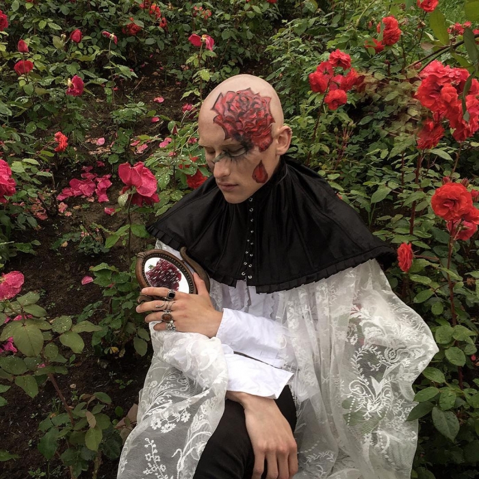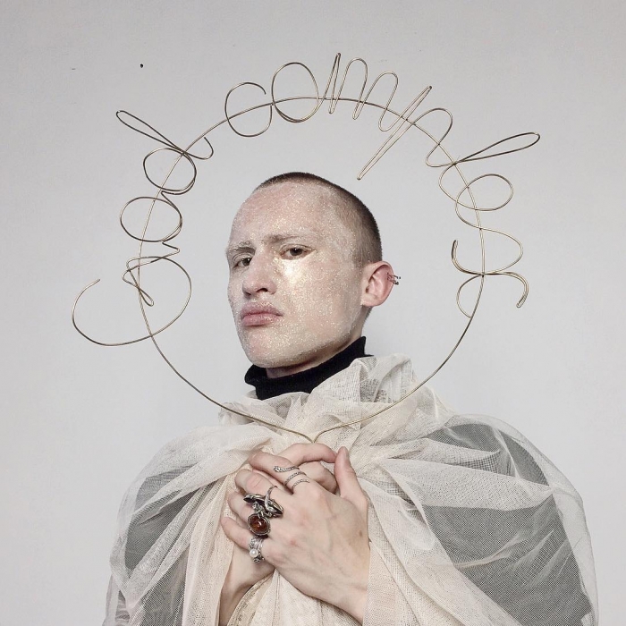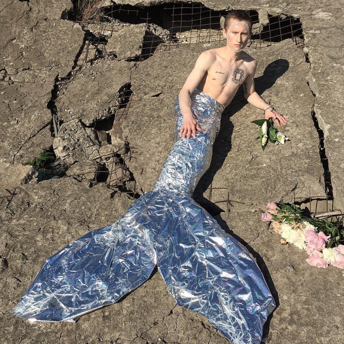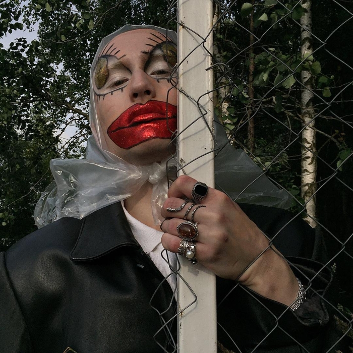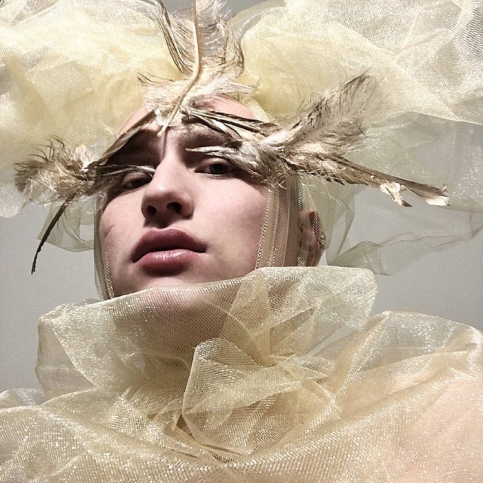Художник из Петербурга Дмитрий Попов, о котором мы писали в конце прошлого года, открыл авангардную выставку-инсталляцию. В антураже бирюзовых стен, персидских ковров и люстры-дискобола он показал самые популярные луки из своего инстаграма: картонный костюм Thom Browne, русалочий хвост из фольги, пиджак из остатков венка и балаклавы как у Martin Margiela (но сделанные из пакетов и кухонных штор).
