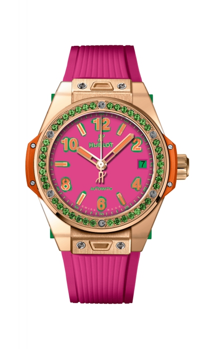 Модель Big Bang Pop Art прибавила один миллиметр в диаметре и научилась менять дизайн одним щелчком: например, к золотому корпусу, оранжевым меткам и ослепительному колье из цаворитов прилагаются три цветных ремешка на застежке One click.