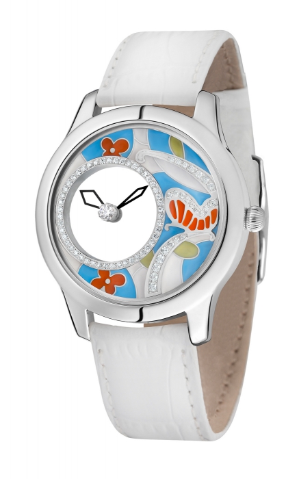 Как тополиный пух в полный штиль, стрелки серебряных часов с гибридным механизмом застыли в воздухе. На фоне жаркого эмалевого неба так же замерли цветы и бабочки с фианитовой пыльцой на крыльях.