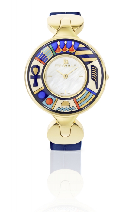 Лотос, скарабей и солнечные лучи разложены по оплавленному золотом диску ювелирных часов в дизайне «Тутанхамон».