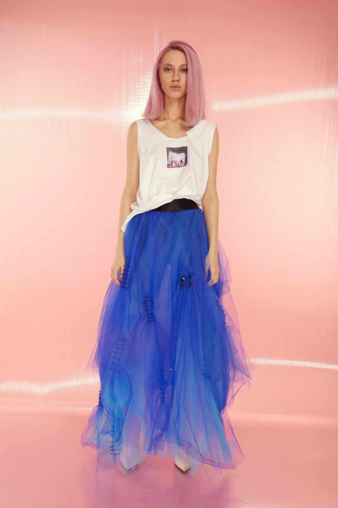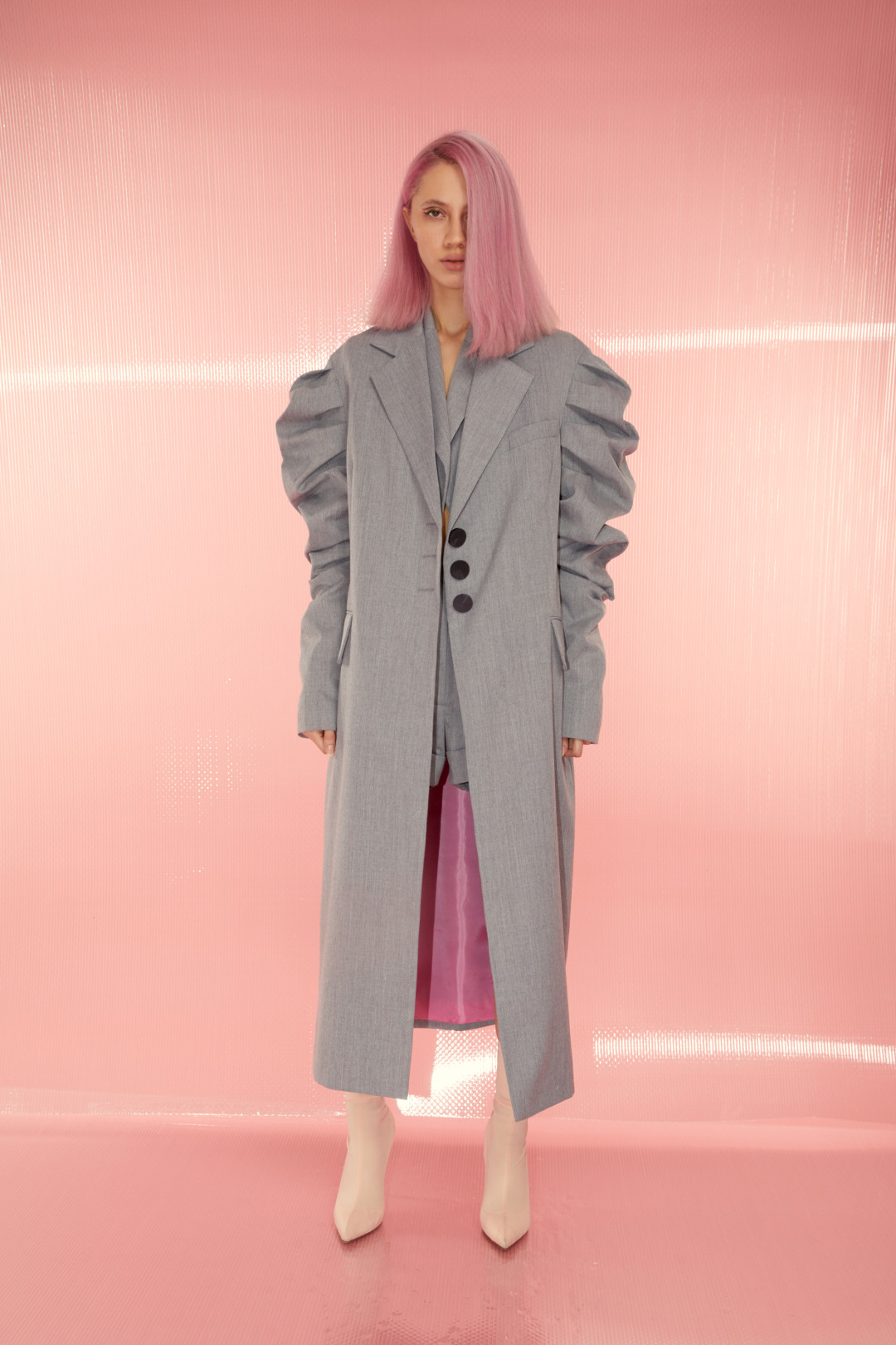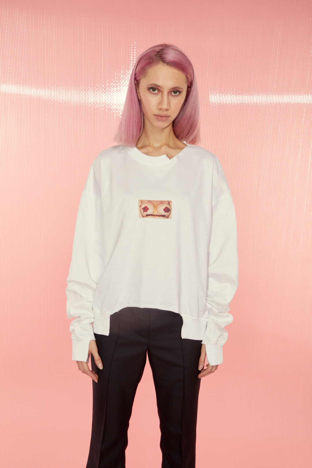 Эфемерное настроение коллекции дополняют лаконичные свитшоты с напечатанной кассетой на груди (и грудью на ней!) и пальто с драпированными рукавами – намек на то, что в мире должно оставаться место для базовых ценностей и монументальных вещей. Дизайнер бренда Алена Феликсова и креативный директор Антон Рудзат, объясняя вложенные смыслы и скрытые отсылки, определяют новую концепцию как романтик-грандж и планируют придерживаться ее и в будущем.