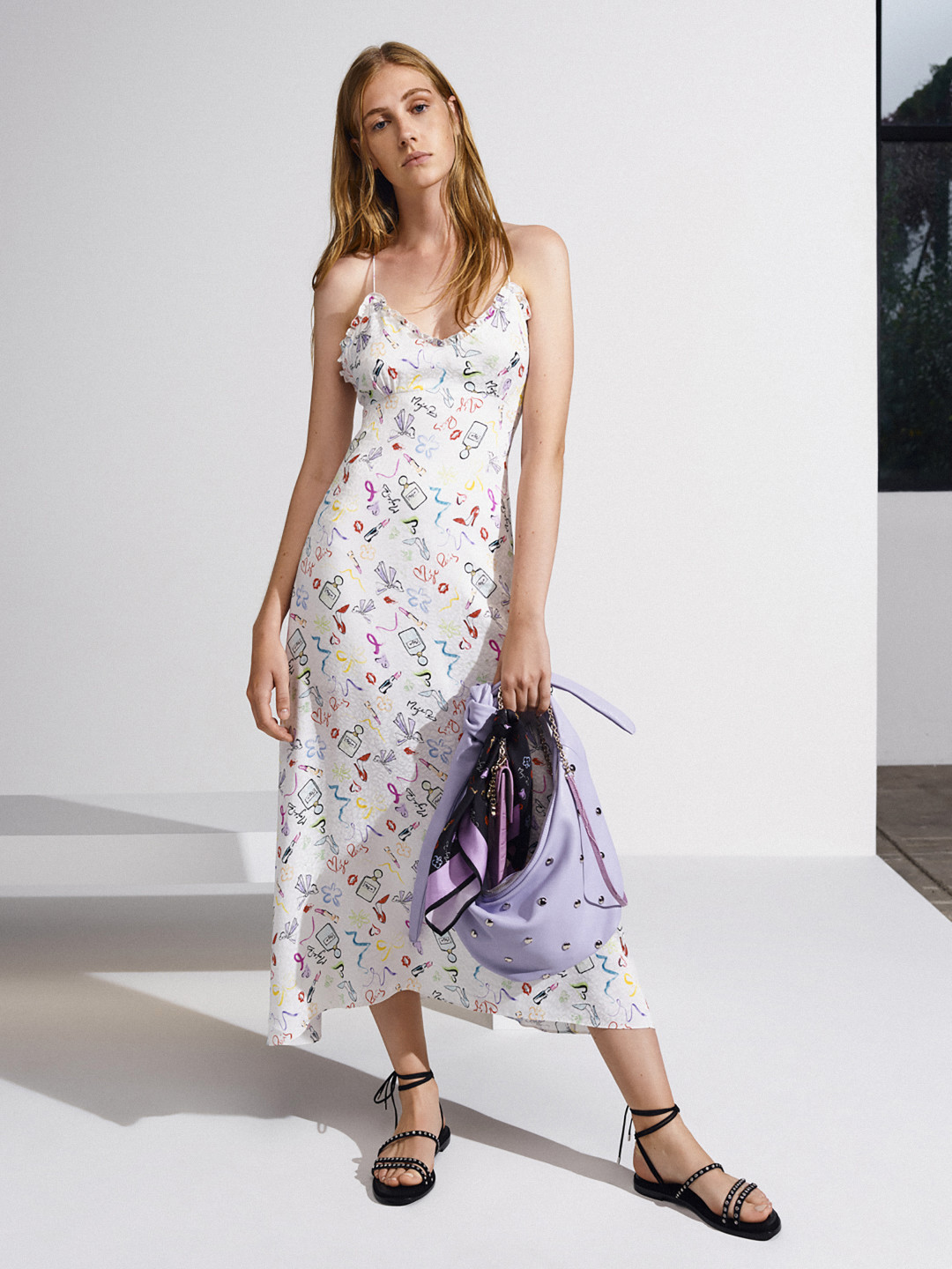 Все самое парижское — это про бренд Maje. Что это значит? Сочетание остромодного с базовым, предельно удобные, но очень красивые вещи, в которых видно человека, а не бренд. И летняя коллекция именно такая: белое струящееся платье миди в бельевом стиле из атласного жаккарда с принтом, будто нарисованном цветными карандашами, — идеально для лета в городе. Гранжевые босоножки на небольшой танкетке – самая классная обувь сезона. Ну а сумку лавандового цвета с ручками-бантами и заклепками надо немедленно выгуливать на самые красивые террасы города. Не забудте повязать на нее платок — tres parisienne!