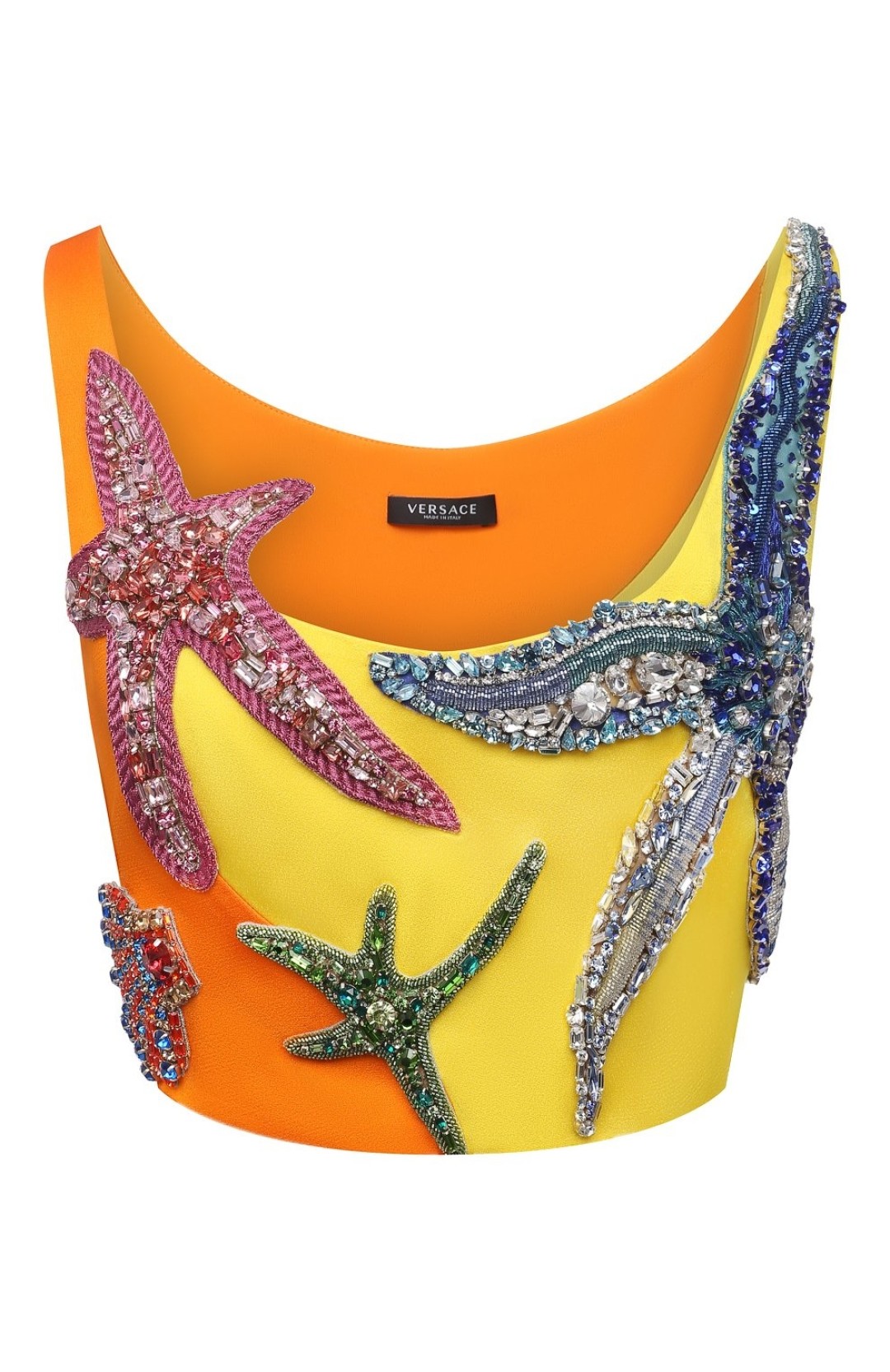 Самый сказочный топ сезона — расшитый гигантскими морскими звездами Versace в самых актуальных цветах — лимонном и оранжевом.