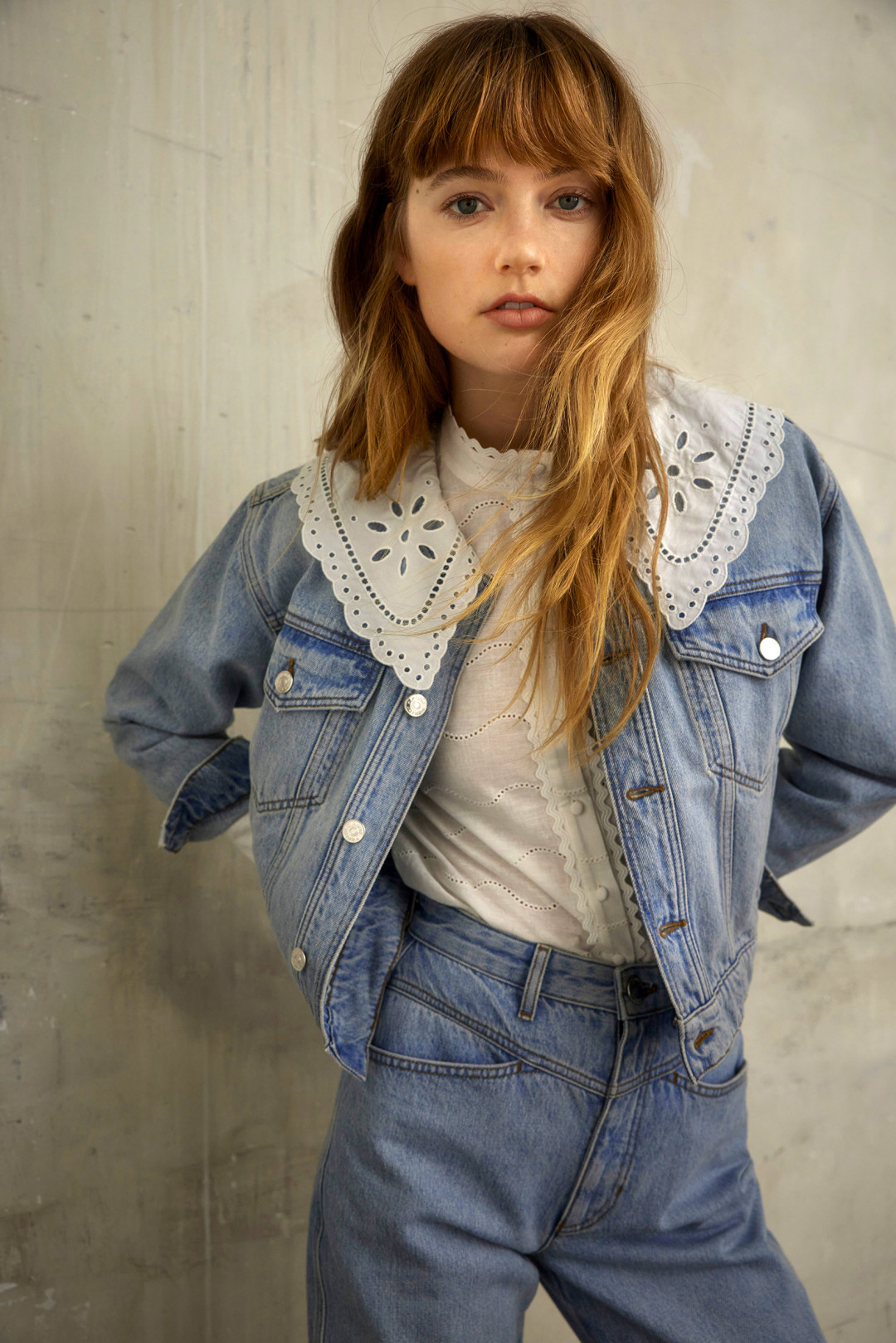 Джинсовый тотал-лук от Claudie Pierlot никогда не был нежнее — трогательный воротничок куртки делает весь образ. И замените футболку на белоснежную рубашку с кружевом и пуговками, обтянутыми тканью — теперь носят именно так.