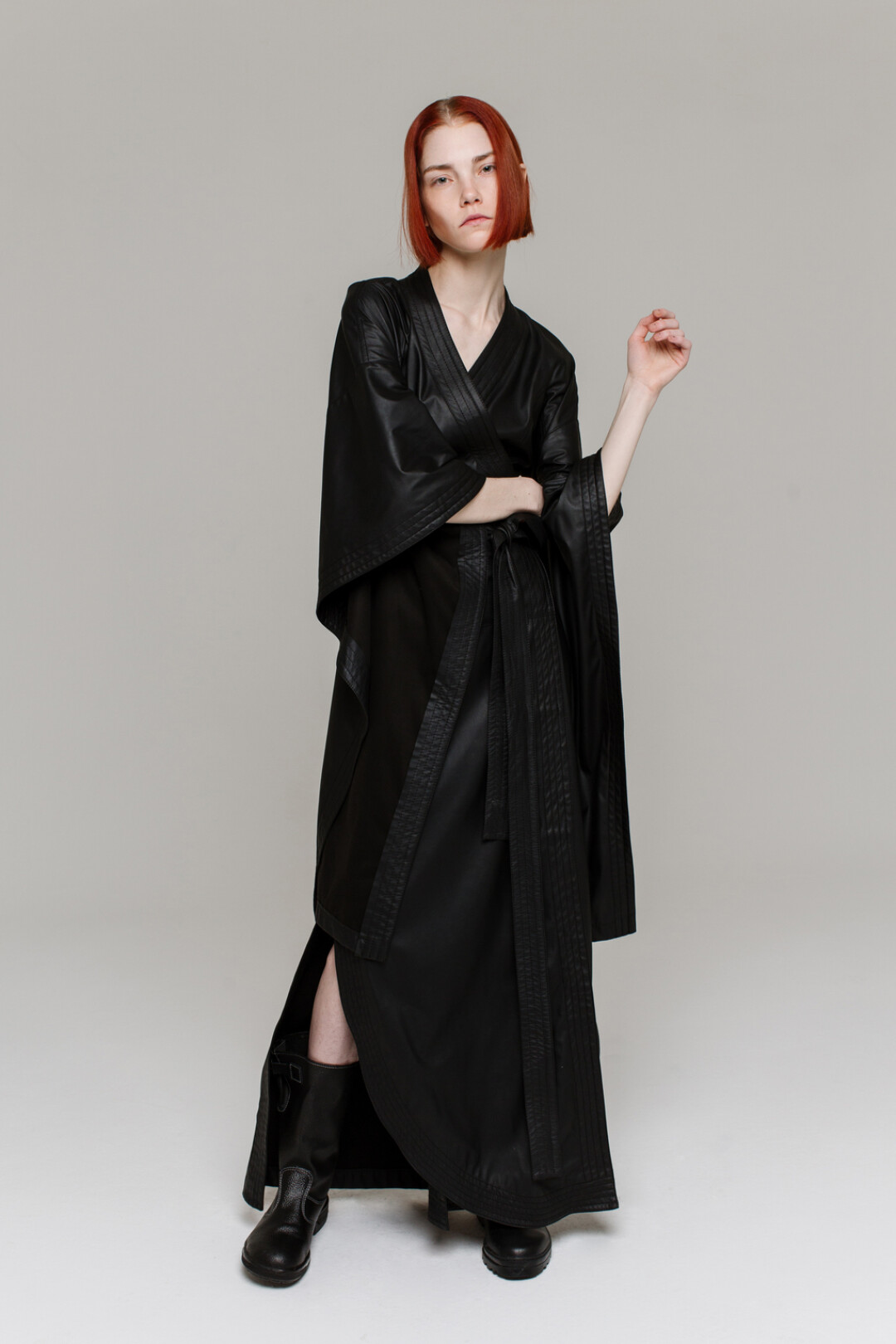 Первый и единственный российский бренд, который делает плащи, как в «Матрице», и косухи, как у берлинских модников, из яблочной кожуры — кожи, состоящей на 50% из яблок. Наш выбор — кожаные унисекс-кимоно и брюки с молниями, которые просятся в гардероб Ye.