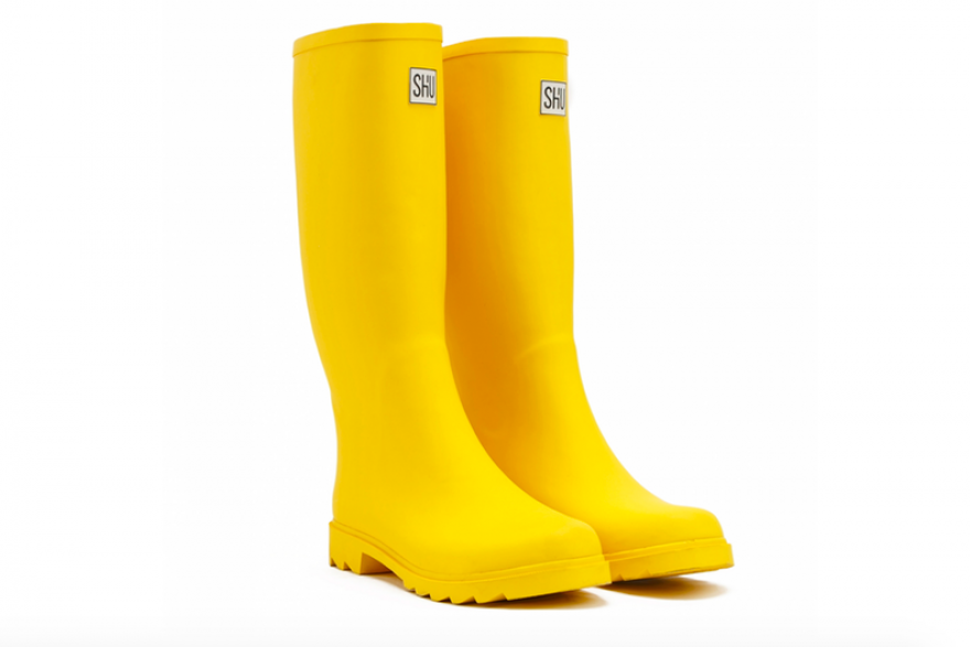 Новость от локального бренда в преддверии майской грозы: в ассортименте SH’U — пополнение. Теперь марка выпускает резиновые сапоги, в которых не будет жарко и летом (рекомендуемая температура для носки — от +10 до +30 градусов). Легкая обувь из натуральной резины на небольшом каблуке доступна в женских размерах, от 36 до 41, и в двух цветах — черном и желтом. Цена — 3 900 рублей.