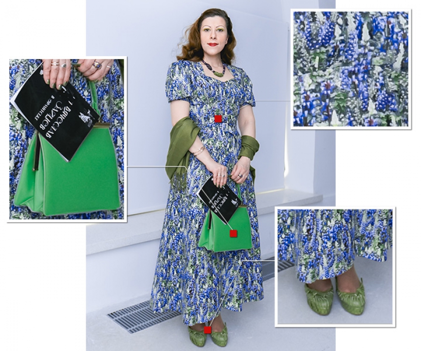 Историк моды, реконструктор и коллекционер винтажной одежды Мэган Виртанен может претендовать на роль городской достопримечательности. По крайней мере, ее выход (на этот раз — в сшитом на заказ платье, туфлях Dior и с винтажной сумкой из 1950-х США) мы ждали так же сильно, как и выставку Вячеслава Зайцева.