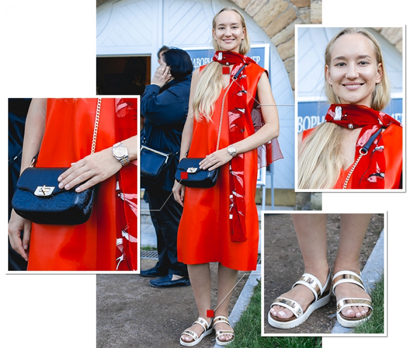 Полина Сидихина знает не только, как сочетать наряд, будто для красной дорожки, с непосредственными сандалиями и повседневной сумкой Eleganzza, но и как выглядеть при этом патриотично: платье для актрисы сделал петербургский бренд Yana Segetti, а палантин с чайками на закате — модный дом Tatyana Parfionova.