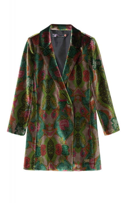 Орнамент пальто Desigual — фантазия на тему образцов стамбульского дворца Топкапы. Переходы лазурного в рубиновый и изумрудный на самом актуальном материале сезона — бархате — складываются то в узор пейсли, то в причудливый цветочный принт. (butik.ru)
