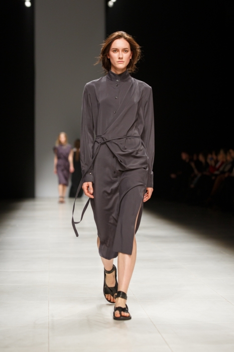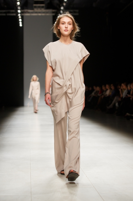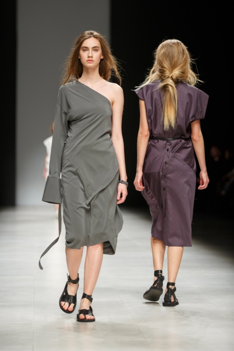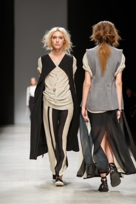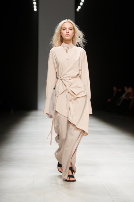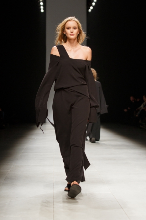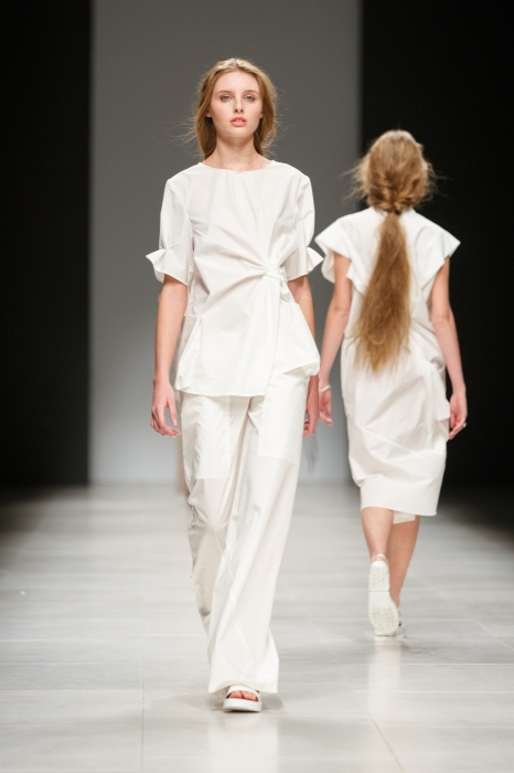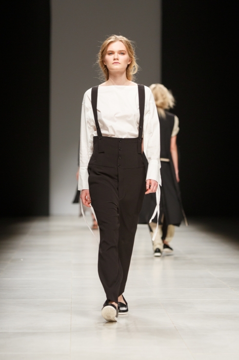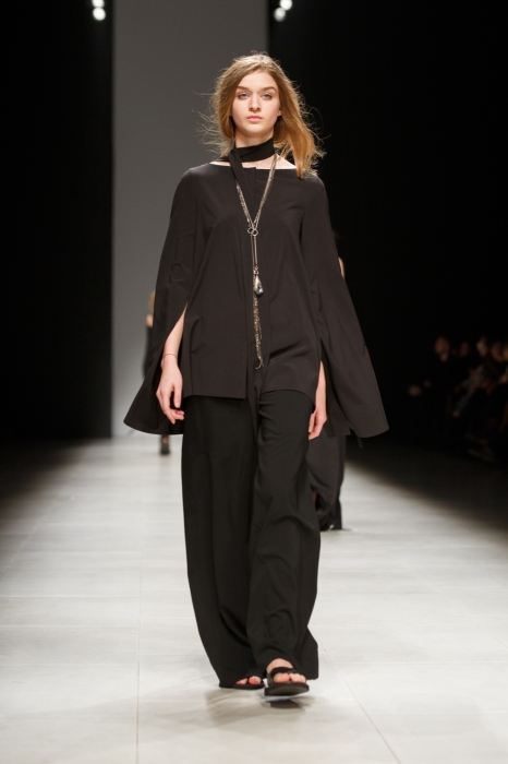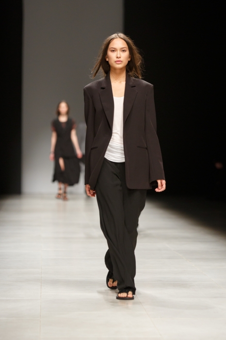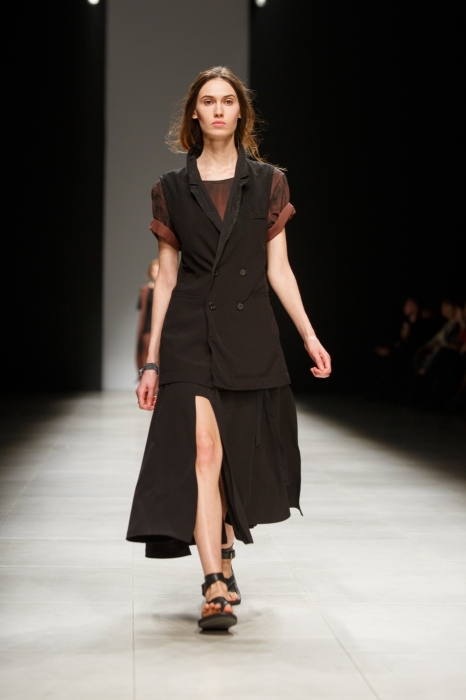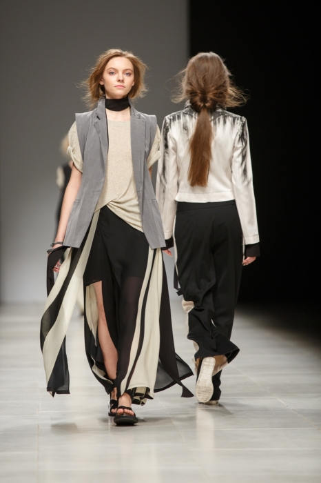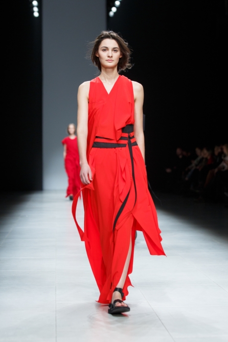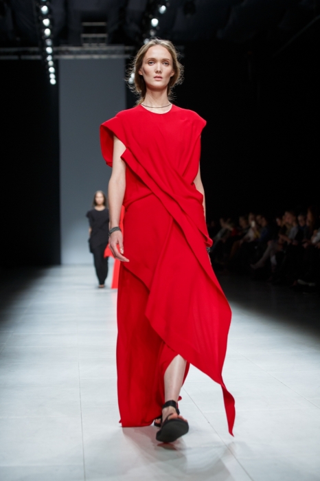 Цветовая палитра — традиционная для Яниса: черный, серый и белые, которые плавно перешли в пастель и закончились алым. Много oversize-платьев и жилетов, сорочек и свободных костюмов, которые органично уживались с остромодными нарядами на одно плечо и легкими шифоновыми юбками.