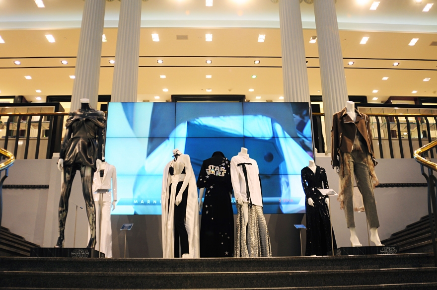 Накануне премьеры саги «Звездные войны. Изгой» специально для ЦУМа и ДЛТ российские дизайнеры подготовили костюмы, навеянные образами культовых персонажей. В проекте приняли участие Александр Терехов, Александр Арутюнов, Алена Ахмадулина, Валентина Юдашкин, Игорь Чапурин, Ольга Вильшенко, Юлия Калманович и сестры Рубан. Экспозицию можно посмотреть на первом этаже ДЛТ до 10 ноября. Также выпущена капсульная коллекция с футболками и свитшотами, в которых можно эффектно отправиться на премьеру фильма 15 декабря.