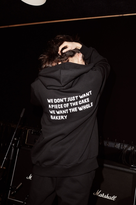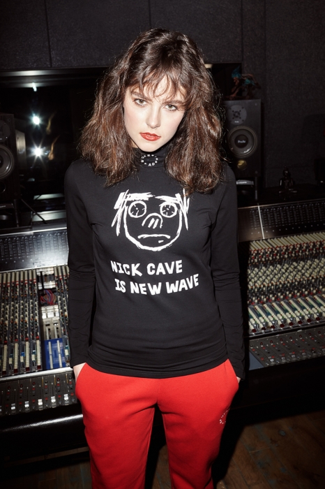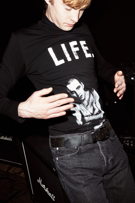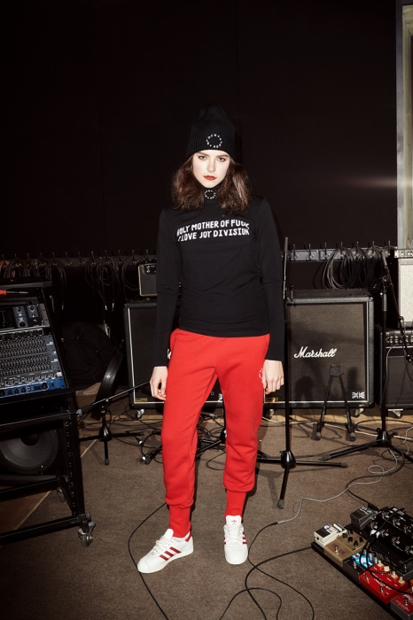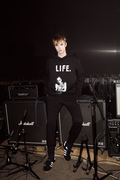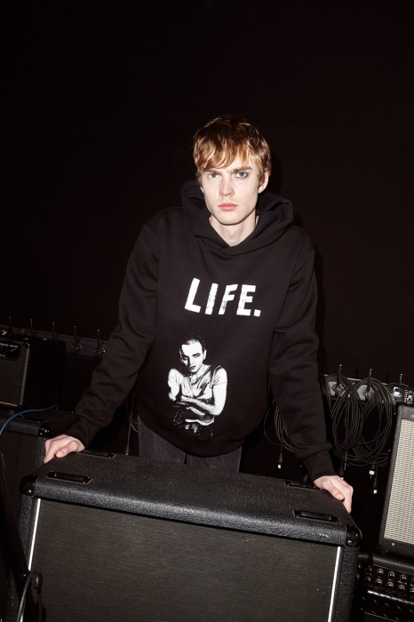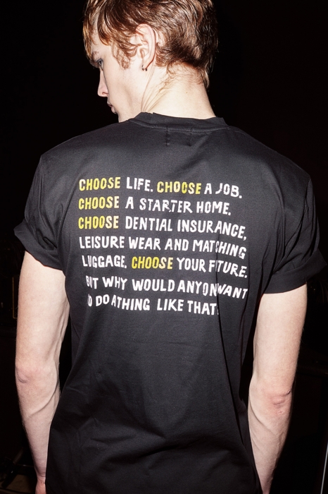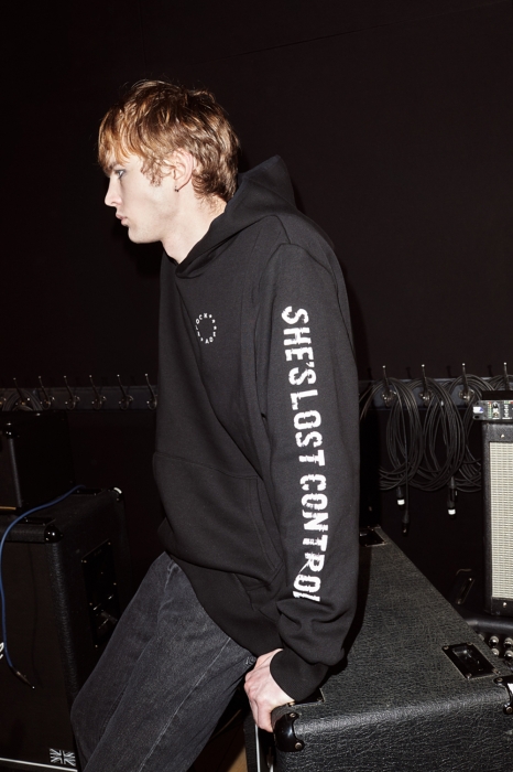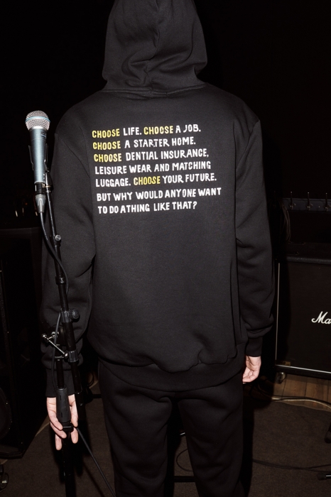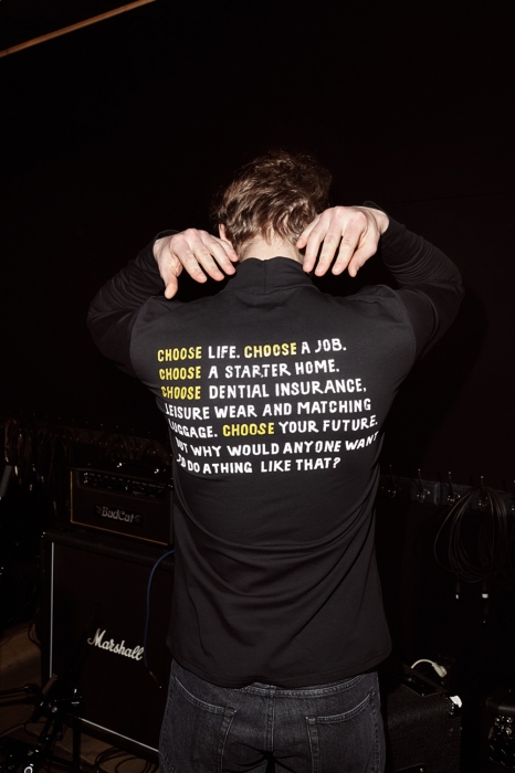 «Два принта коллекции посвящены культовой группе Joy Division, которая имела значительное влияние на музыкальную трансформацию не только на советском и пост-советском пространстве, но и в мире в целом. «Все тогда хотели быть как Joy Division» — цитата музыкантов того времени. Принт «Holy mother of fuck i love Joy Division» — это граффити в одном из подземных переходов Берлина. А принт «She’s lost control» — название одной из популярных песен группы. Еще мы вспомнили Марка Рентона, киносимвола того времени: стильного, разбирающегося в музыке молодого парня с зависимостью, который все равно в конце, пройдя через огонь и воду, выбирает жизнь: «Сhoose life. Choose a job. Choose…LIFE»