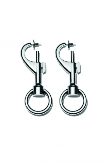 Брутальные серьги-карабины Michael Kors Collection требуют в пару либо пастельных шелковых блуз для контраста, либо строгих стальных костюмов-троек для усиления эффекта. (ДЛТ)