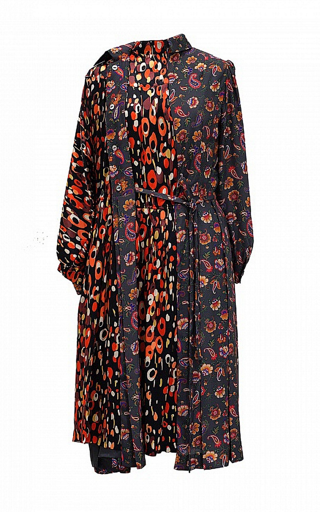 Дизайнер Джуниа Ватанабе продолжает нелегкое дело деконструкции и сшивает гранжевые платья из всех возможных принтов. Дарковый микс из иката и пейсли иронично назван «кавайи», как и вся довольно драматичная коллекция. (Comme des Garcons)