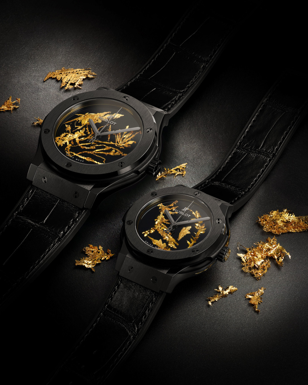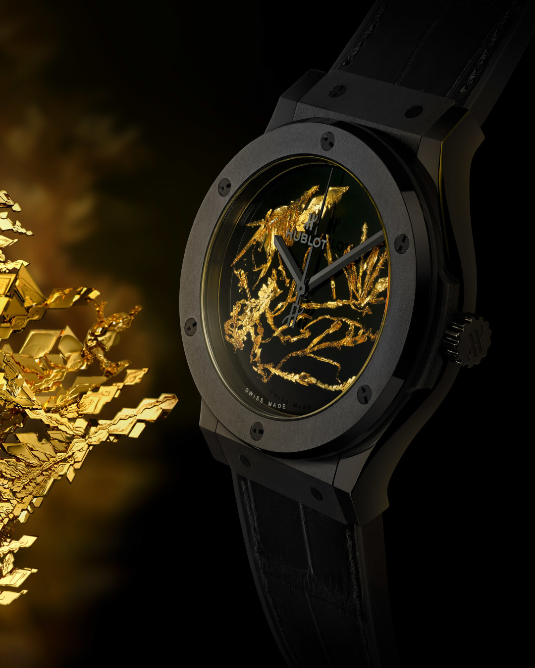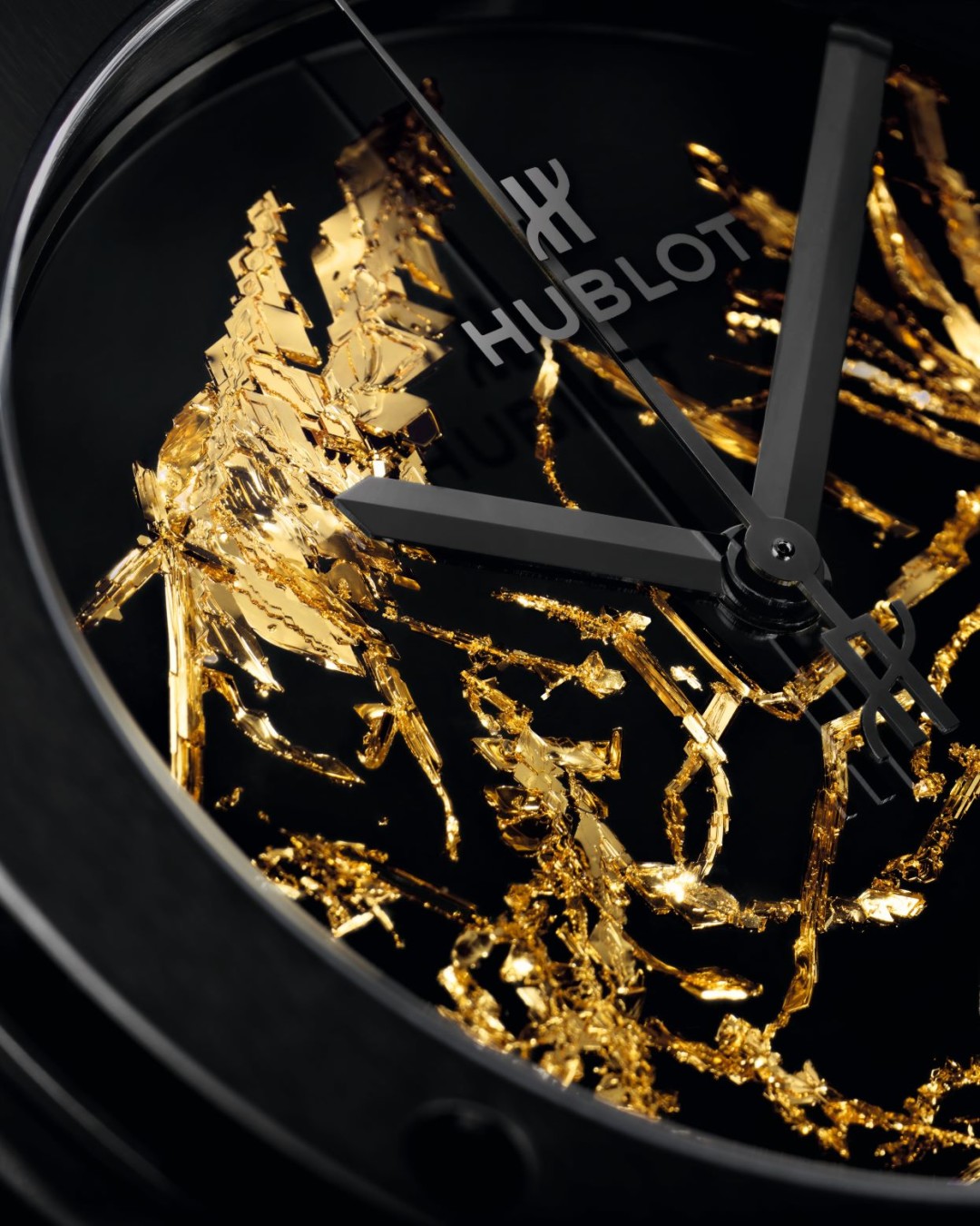На выставке LVMH в Дубае швейцарский бренд продемонстрировал, что золото в часовом деле не только не исчерпало себя, но и может принимать новые удивительные формы. На черном циферблате новинки разместили кристаллы 24-каратного золота, вручную созданные специалистами Hublot – в природе драгоценный металл в такой форме почти не встречается.