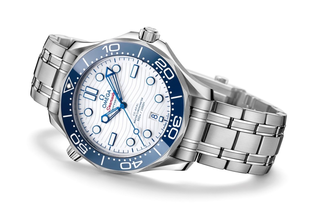 Высокотехнологичные OMEGA Seamaster Diver 300M Tokyo 2020 выполнены в цветовой гамме, созвучной эмблеме Олимпийских игр-2020. Их 42-миллиметровый корпус изготовлен из нержавеющей стали и оснащен синим керамическим безелем с дайверской шкалой из белой эмали. Интегрированный в корпус браслет с чередованием матовых и полированных поверхностей также изготовлен из нержавеющей стали. Выгравированные лазером волны на циферблате из белой глянцевой керамики придают ему дополнительную глубину. Окошко даты расположено в положении «6 часов», а название самой линейки Seamaster выделено красным. Завершают образ вороненые стрелки и индексы, заполненные белым люминесцентным составом Super-LumiNova.