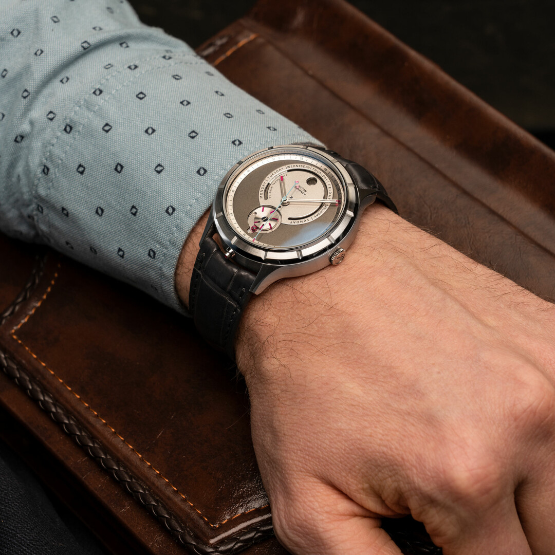 Модель с авторским калибром оснащена редкой периферийной системой автоматического завода. Индикация дня недели выполнена в виде субциферблата с секторами, обозначающими дни недели. Шторка с надписью Today (то есть «сегодня») перемещается с одного дня на другой ровно в полночь.